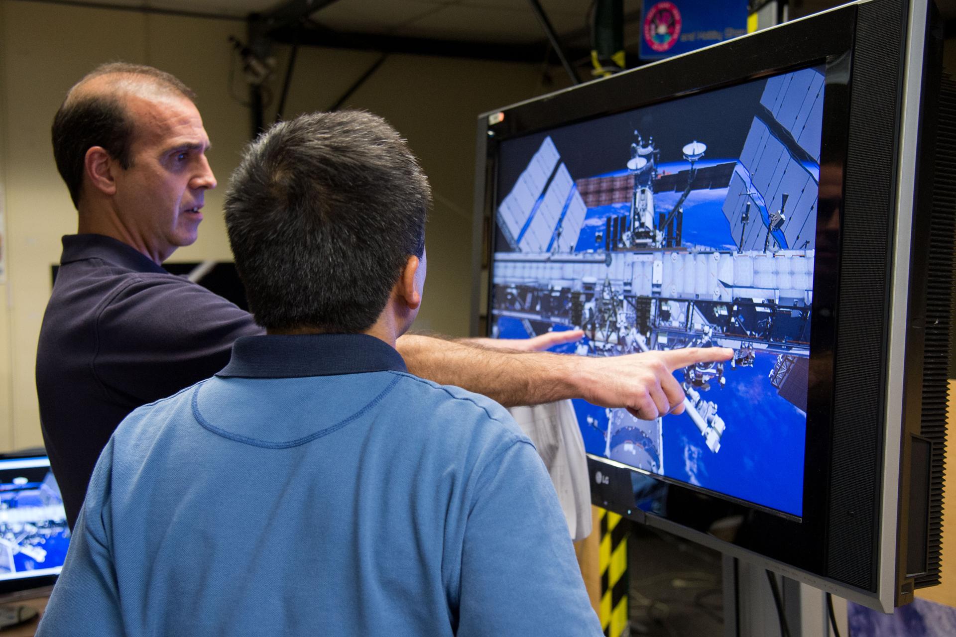 DATE: 11-5-12 LOCATION: Bldg. 9 - VR Lab SUBJECT: Expedition 38 crew members Mike Hopkins, Rick Mastracchio and Koichi Wakata during ROBO/EVA VR LAB training with instructors Jason A. Campbell and Alex Kanelakos. PHOTOGRAPHER: Lauren Harnett