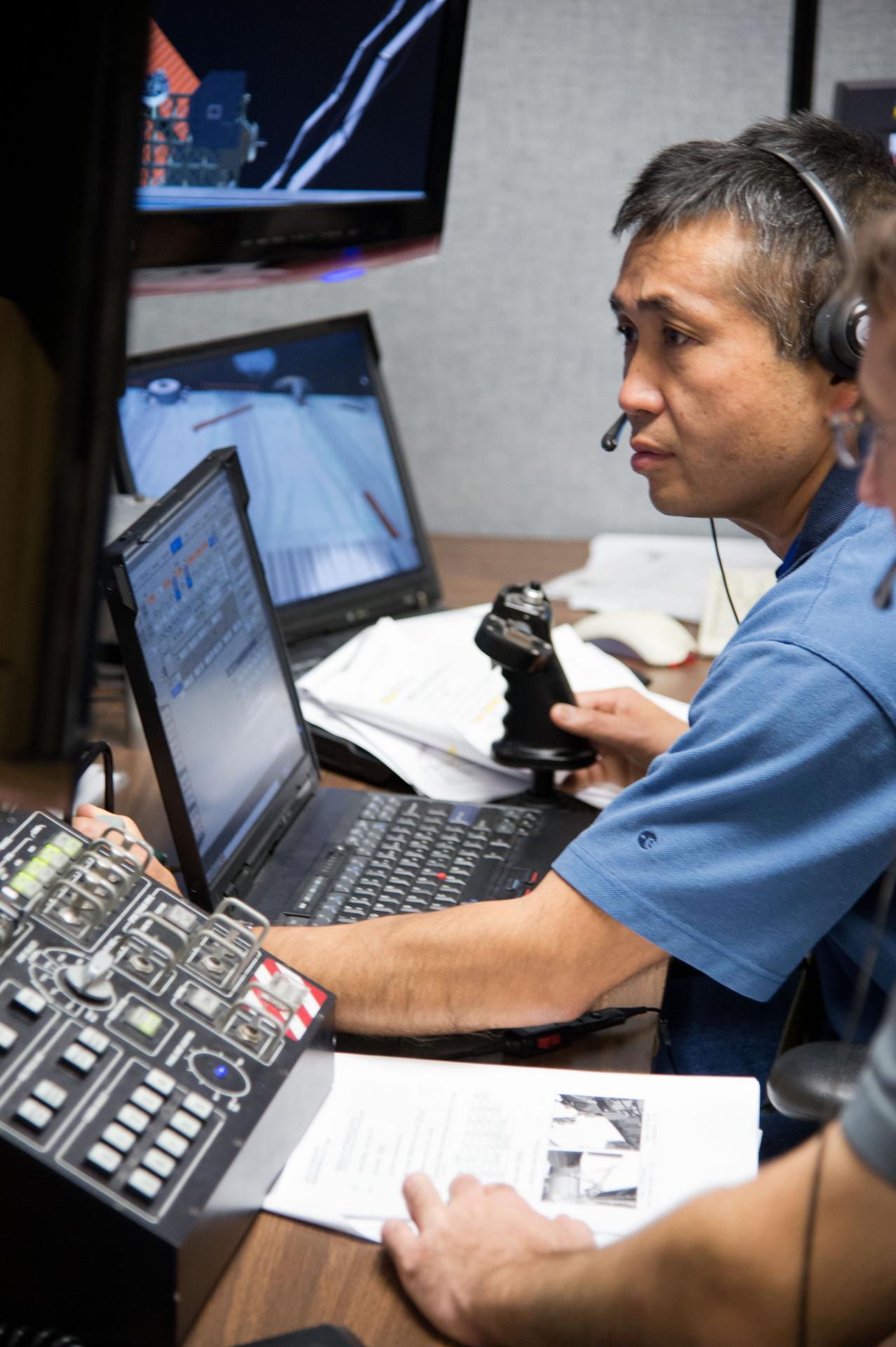 DATE: 11-5-12 LOCATION: Bldg. 9 - VR Lab SUBJECT: Expedition 38 crew members Mike Hopkins, Rick Mastracchio and Koichi Wakata during ROBO/EVA VR LAB training with instructors Jason A. Campbell and Alex Kanelakos. PHOTOGRAPHER: Lauren Harnett