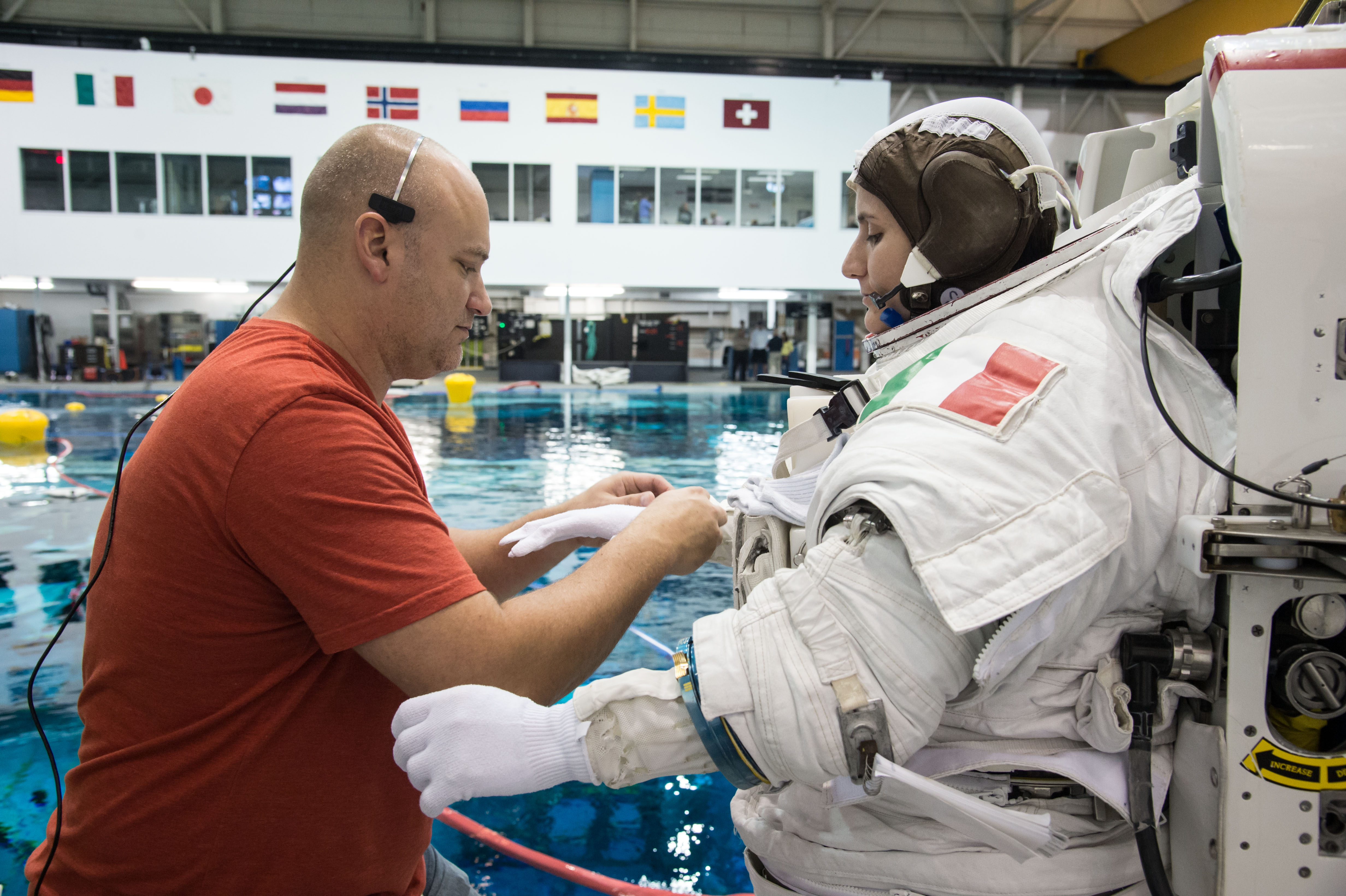 PHOTO DATE: 11-21-12 LOCATION: NBL - Pool Topside SUBJECT: Expedition 42/43 crew member and Italian ESA astronaut Samantha Cristoforetti with NASA astronaut Terry Virts during INC-42/CB EVA SKILLS 21027. PHOTOGRAPHER: BILL STAFFORD