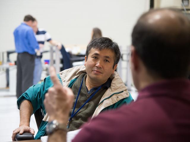 Date: 01-18-13 Location: Bldg 16, SES Dome Subject: Expedition 39 (Soyuz 37) crew members Rick Mastracchio and Koichi Wakata during FF T&C/R MINI SIM 2 training in the building 16 dome with instructor Jeffery "Tux" Tuxhorn. Photogapher: James Blair