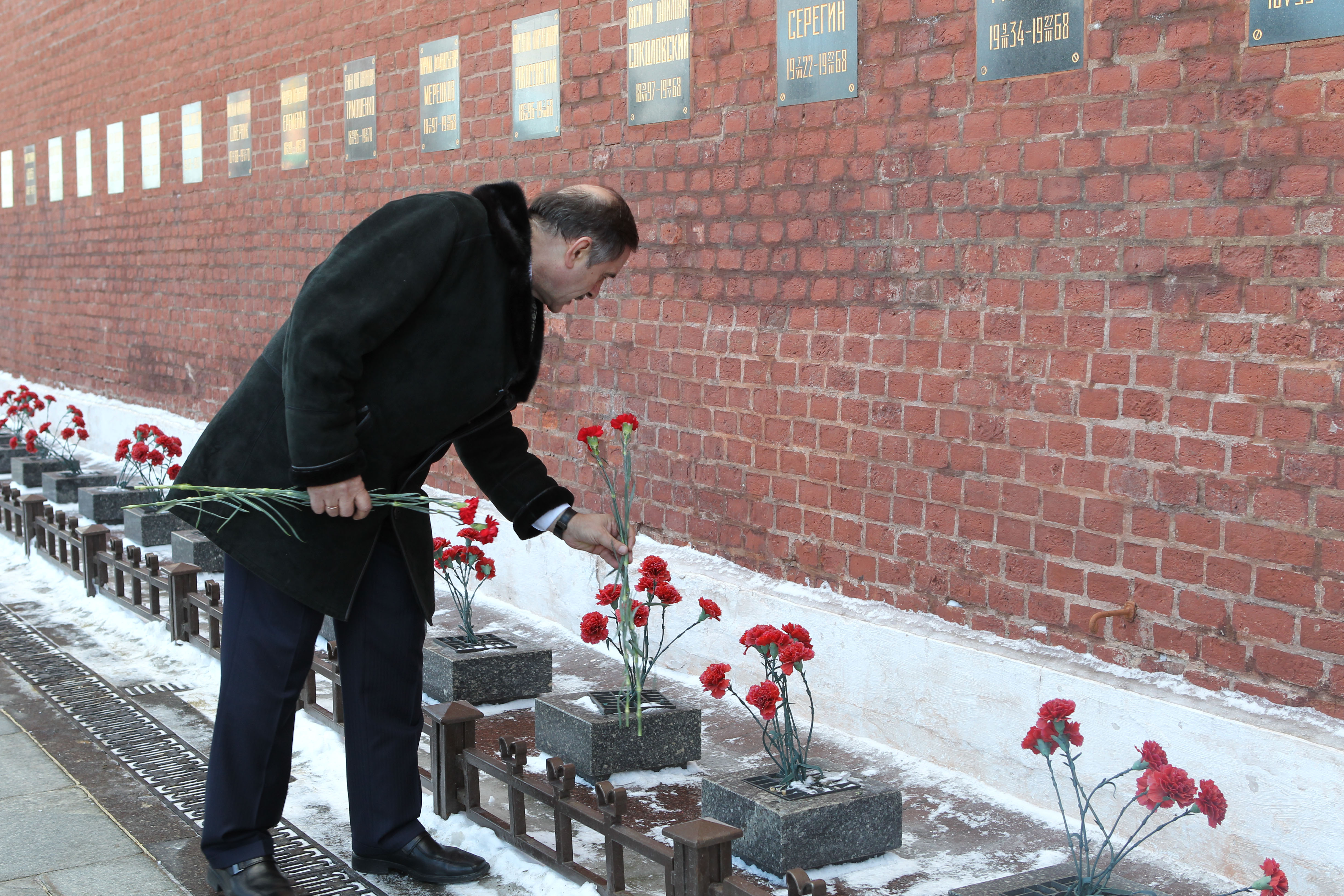 During a traditional tour of Red Square in Moscow March 7, Expedition 35-36 Soyuz Commander Pavel Vinogradov laid flowers at the Kremlin Wall where Russian space icons are interred. Vinogradov, NASA Flight Engineer Chris Cassidy and Flight Engineer Alexander Misurkin will launch to the International Space Station March 29, Kazakh time, in their Soyuz TMA-08M spacecraft from the Baikonur Cosmodrome in Kazakhstan. NASA / Stephanie Stoll