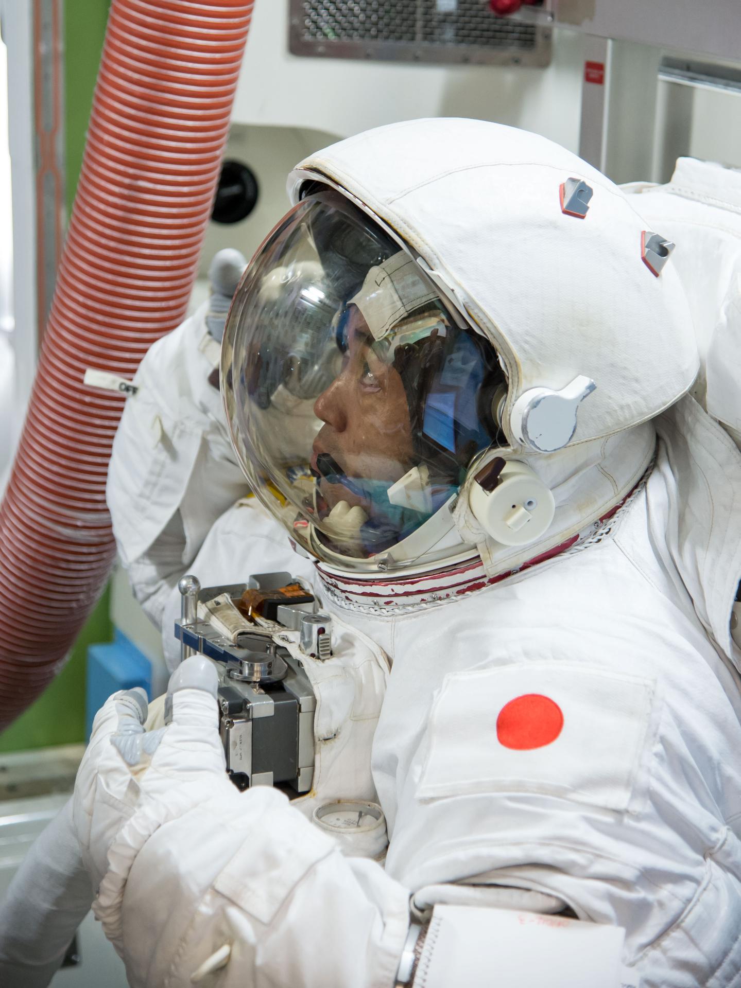 Date: 08-23-13 Location: Bldg 9NW, ISS Airlock Mockup Subject: Expedition 38 crew members Rick Mastracchio and Koichi Wakata during INC-38 ISS EVA Prep & Post #2 training in the ISS Airlock mockup with instructors Megan Murphey, Michael Dino and Tamara York. In addition, non-assigned astronaut Jeanette Epps is participating Photographer: James Blair