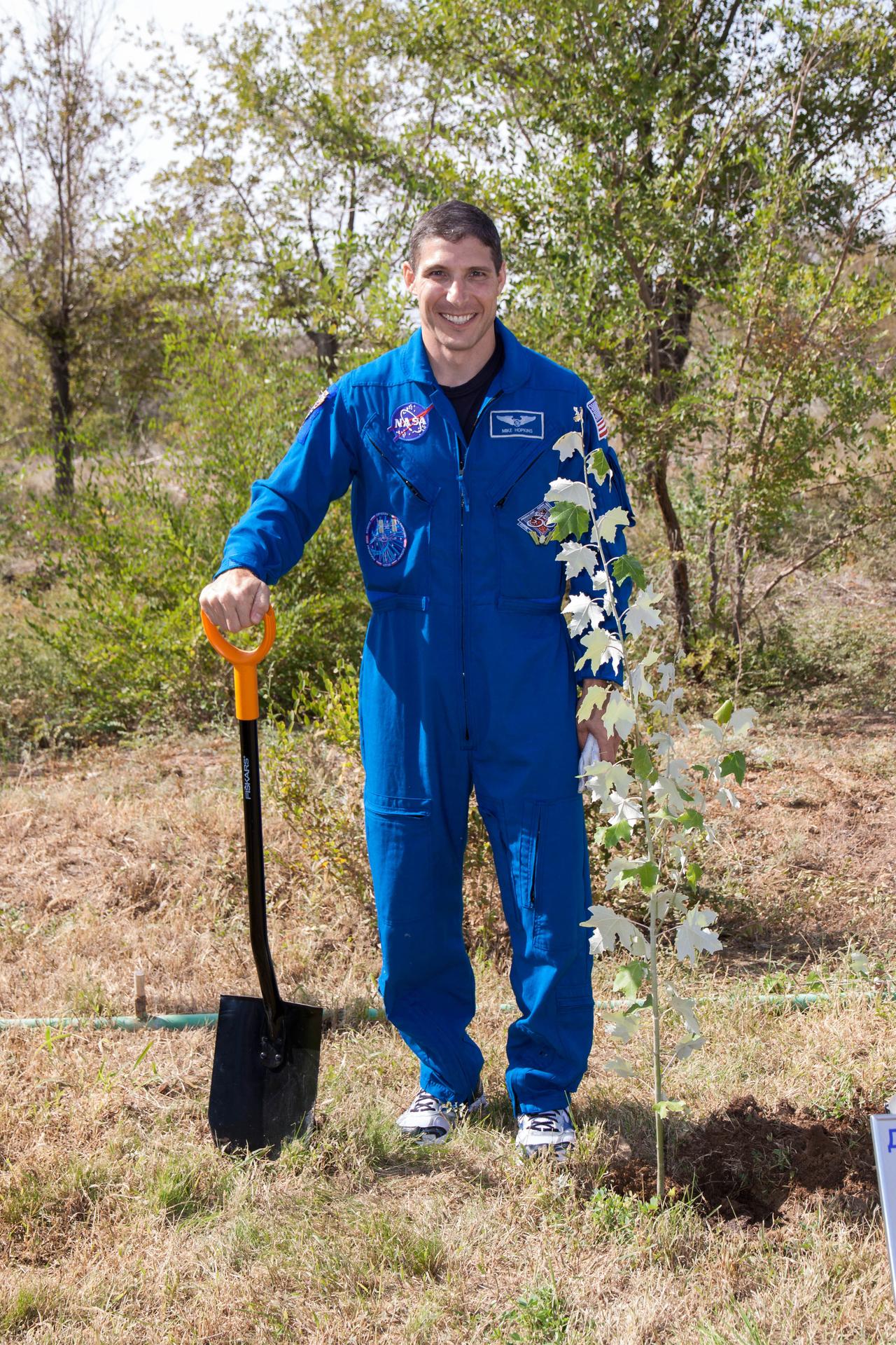 Expedition 37/38 Flight Engineer Michael Hopkins of NASA poses for photos by a tree planted in his name behind the Cosmonaut Hotel crew quarters in Baikonur, Kazakhstan Sept. 18. The tree planting was part of traditional ceremonies as Hopkins, Kotov and Ryazanskiy prepare to launch Sept. 26, Kazakh time, from the Baikonur Cosmodrome on their Soyuz TMA-10M spacecraft for a five and a half month mission on the International Space Station. NASA/Victor Zelentsov