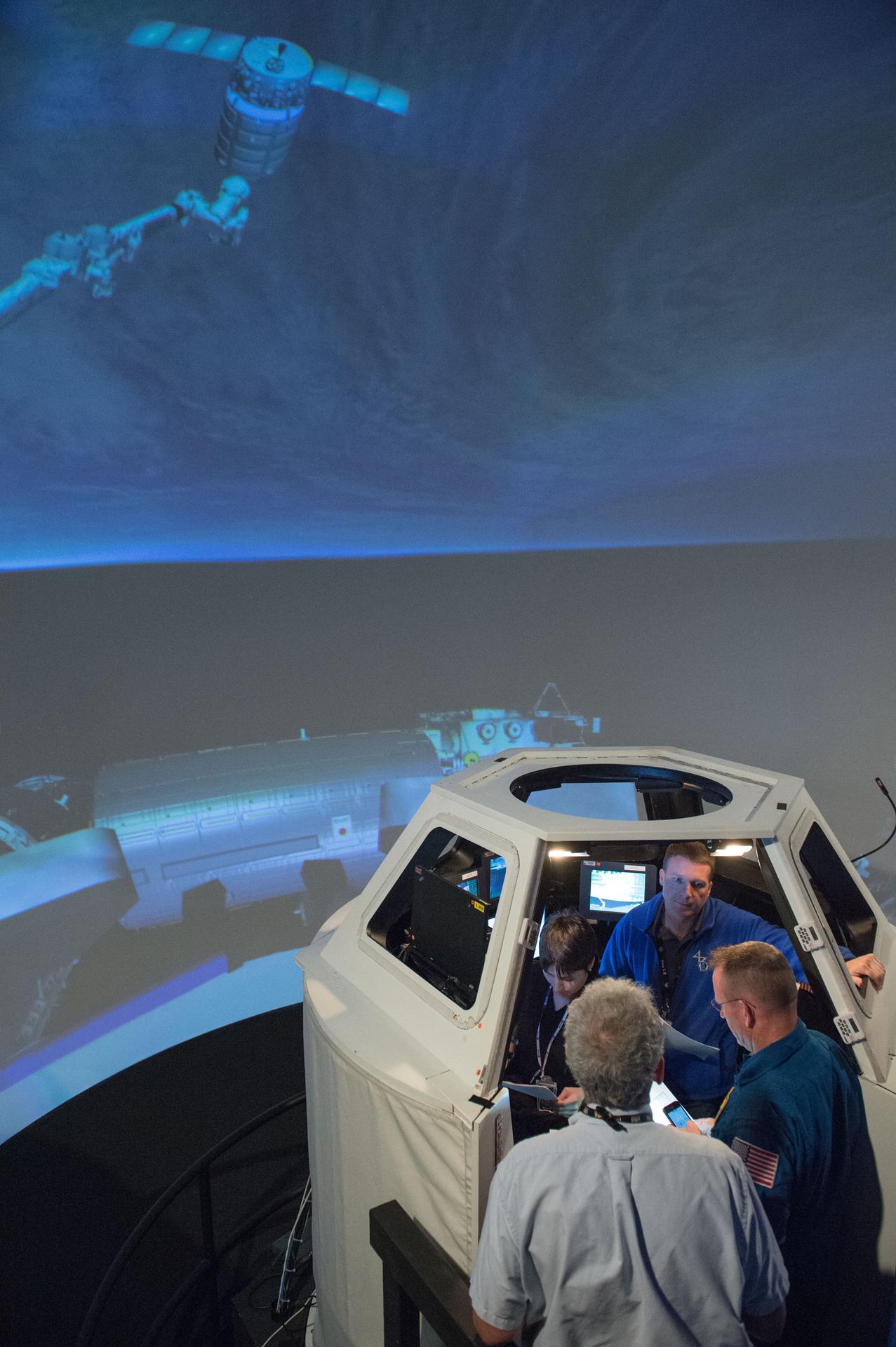DATE: 10-25-13 LOCATION: Bldg 16, Rm 1040 SUBJECT: Expedition 42/43 crew members Samantha Cristoforetti, Barry Wilmore, Terry Virts during FF T&C/R Mini Sim 1 in the SES Alpha Cupola trainer. PHOTOGRAPHER: Lauren Harnett