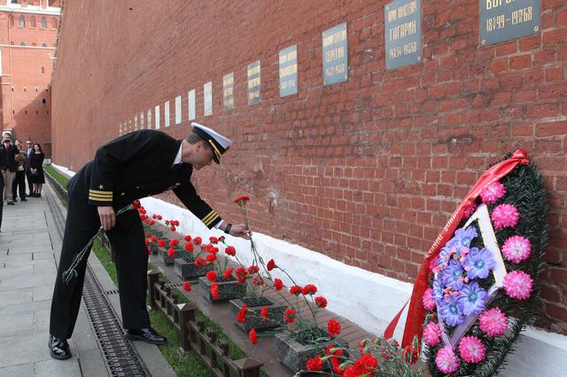 1082: At the Kremlin Wall in Moscow’s Red Square, Expedition 40/41 Flight Engineer Reid Wiseman of NASA lays flowers May 8 at the spot where Yuri Gagarin, the first human to fly in space, is interred. Wiseman, Max Suraev of the Russian Federal Space Agency (Roscosmos) and Alexander Gerst of the European Space Agency are preparing for launch May 29, Kazakh time, in the Soyuz TMA-13M spacecraft from the Baikonur Cosmodrome in Kazakhstan for a 5 ½ month mission on the International Space Station. NASA/Stephanie Stoll