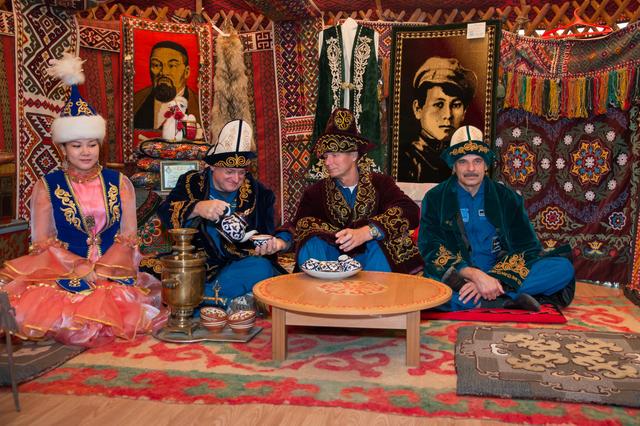14-12-59-00: (14 Sept. 2014) --- Wearing native Kazakh clothing, Expedition 41/42 backup crewmembers Scott Kelly of NASA (second from left), Gennady Padalka of the Russian Federal Space Agency (Roscosmos, second from right) and Mikhail Kornienko of Roscosmos (far right) enjoy the ambiance of a traditional Kazakh lunch in a “yurt”, or tent, during a tour of Baikonur, Kazakhstan Sept. 14. Kelly and Kornienko will launch from Baikonur in March 2015 to spend a full year on the International Space Station. They are backups to Barry Wilmore of NASA, Alexander Samokutyaev of the Russian Federal Space Agency (Roscosmos) and Elena Serova of Roscosmos. Wilmore, Samokutyaev and Serova will launch on Sept. 26, Kazakh time, in the Soyuz TMA-14M spacecraft to begin a 5 ½ month mission on the station. Serova will become the fourth Russian woman to fly in space. NASA/Victor Zelentsov
