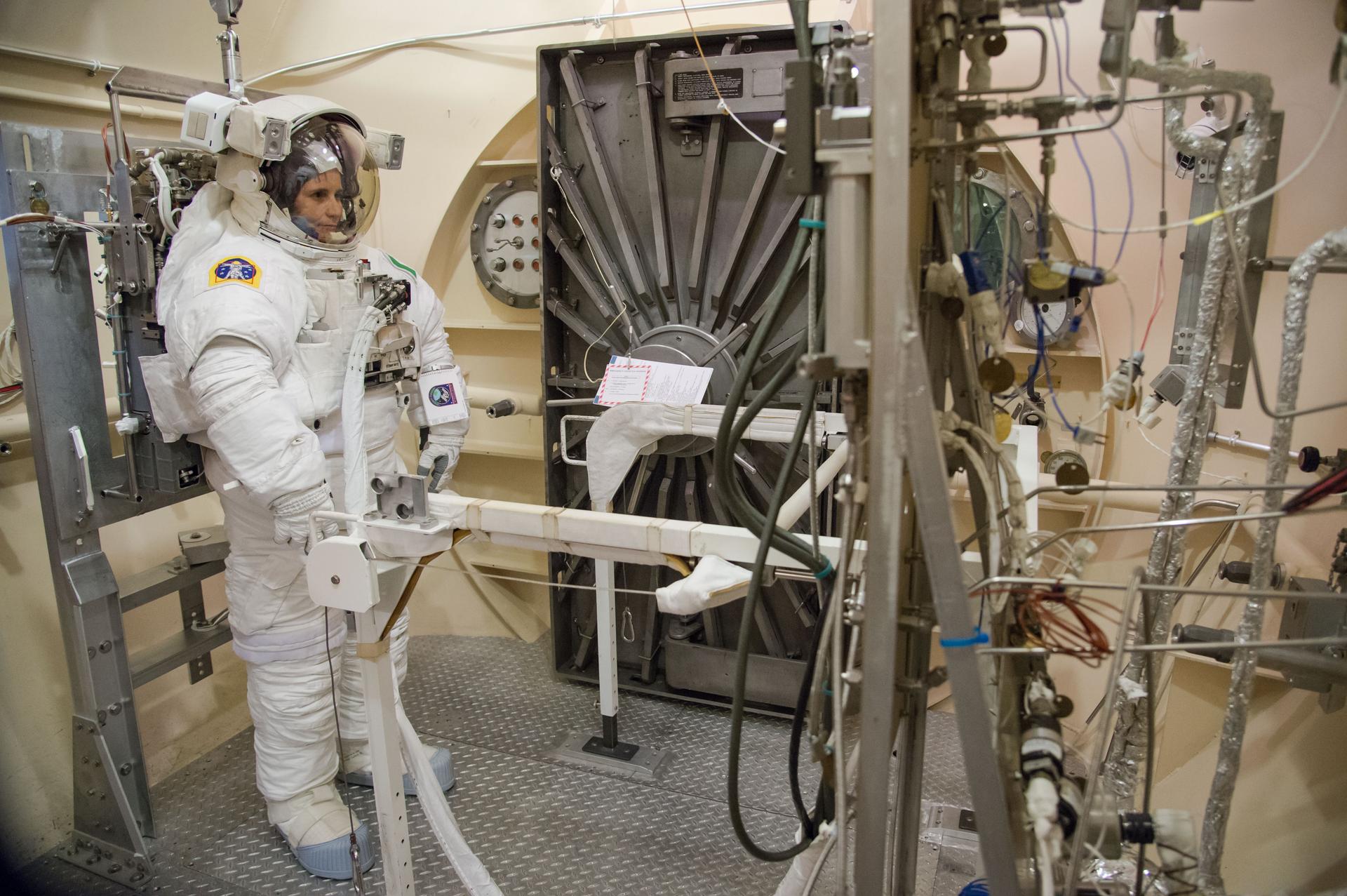 Expedition 42/43 ESA astronaut Samantha Cristoforetti during preparations for EMU Certification Altitude Run. Photo Date: September 22, 2014. Location: Bldg. 7, 11 foot chamber. Photographer: Robert Markowitz