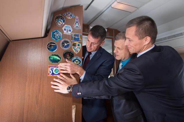 Aboard a Gagarin Cosmonaut Training Center aircraft bound for their launch site at the Baikonur Cosmodrome in Kazakhstan, Expedition 49-50 crewmembers Shane Kimbrough of NASA (left), and Andrey Borisenko (center) and Sergey Ryzhikov of Roscosmos (right) affix an Expedition 50 crew decal to a door Sept. 8 in a traditional ceremony. The trio will launch on Sept. 24, Kazakh time on the Soyuz MS-02 spacecraft for a five-month mission on the International Space Station. NASA/Victor Zelentsov