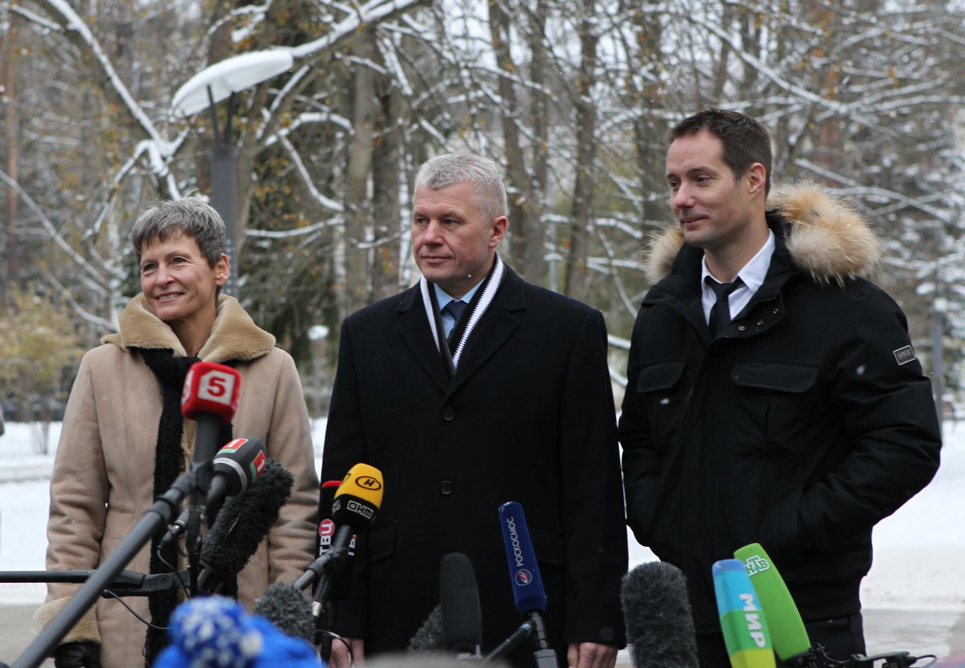 At the Gagarin Cosmonaut Training Center in Star City, Russia, Expedition 50-51 crewmembers Peggy Whitson of NASA (left), Oleg Novitskiy of the Russian Federal Space Agency (Roscosmos, center) and Thomas Pesquet of the European Space Agency (right) answer questions from reporters Nov. 1 before for their launch site in Baikonur, Kazakhstan. The trio will launch Nov. 18, Baikonur time, on the Soyuz MS-03 spacecraft for a six-month mission on the International Space Station. NASA/Stephanie Stoll
