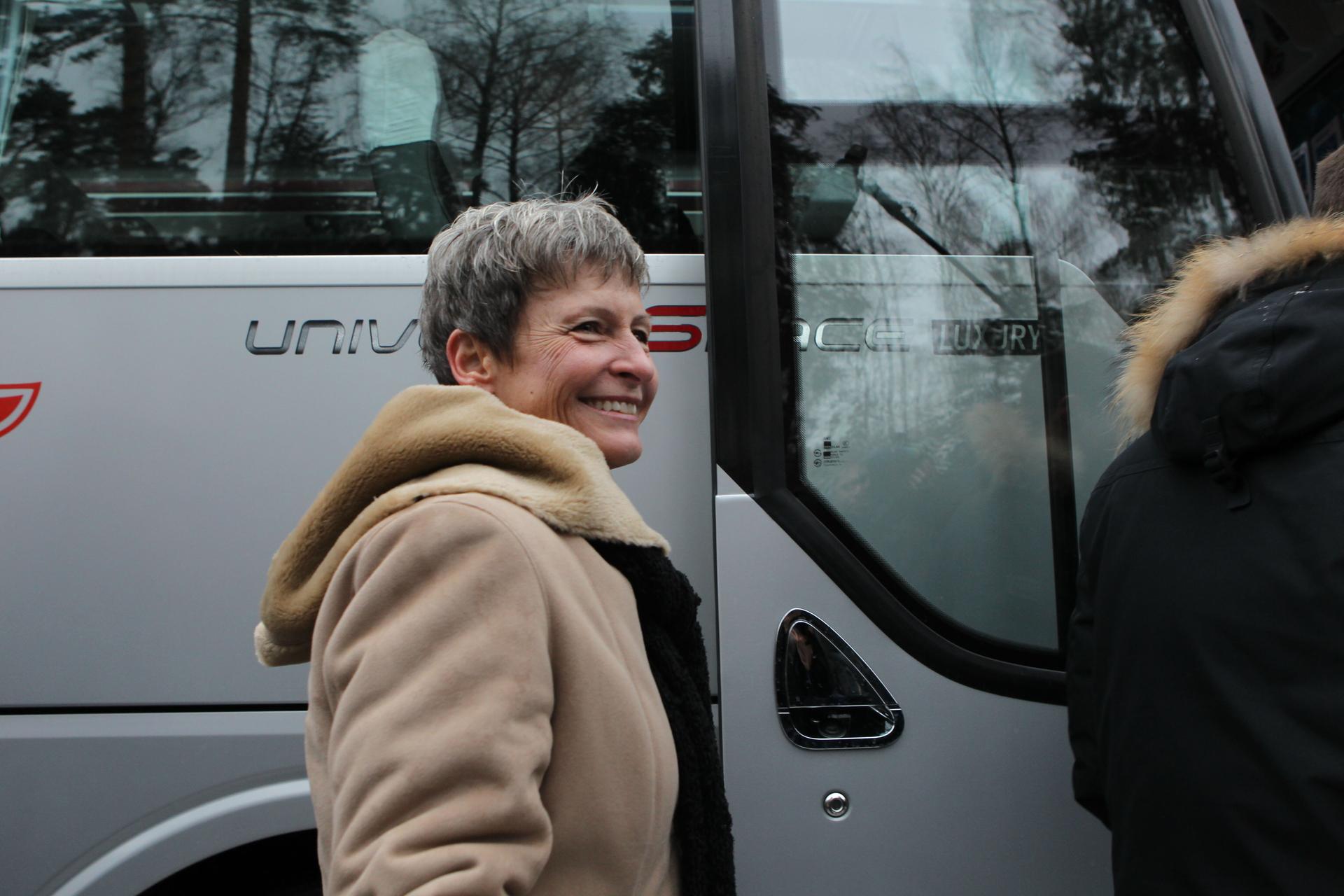 At the Gagarin Cosmonaut Training Center in Star City, Russia, Expedition 50-51 crewmember Peggy Whitson of NASA flashes a smile before boarding a bus Nov. 1 to her and her crewmates to a plane to fly to their launch site in Baikonur, Kazakhstan. Whitson, Oleg Novitskiy of the Russian Federal Space Agency (Roscosmos) and Thomas Pesquet of the European Space Agency will launch Nov. 18, Baikonur time, on the Soyuz MS-03 spacecraft for a six-month mission on the International Space Station. NASA/Stephanie Stoll