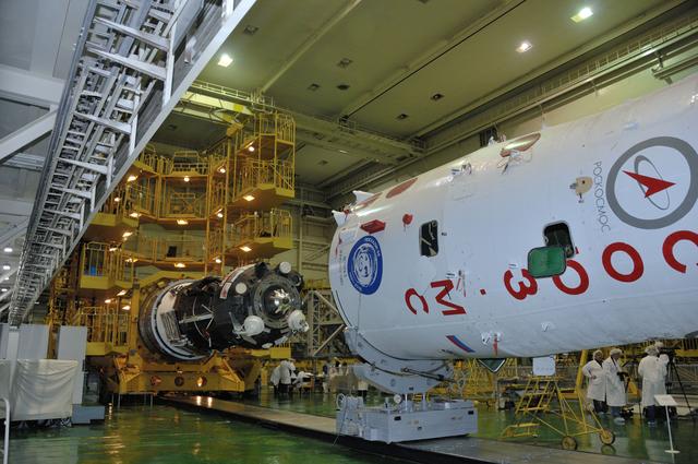 In the Integration Facility at the Baikonur Cosmodrome in Kazakhstan, the Soyuz MS-03 spacecraft (left) sits in its horizontal position, poised for its encapsulation into the upper stage of its Soyuz booster Nov. 9. Expedition 50-51 crewmembers Peggy Whitson of NASA, Oleg Novitskiy of the Russian Federal Space Agency (Roscosmos) and Thomas Pesquet of the European Space Agency will launch on the Soyuz Nov. 18, Baikonur time, for a six-month mission on the International Space Station. NASA/Alexander Vysotsky