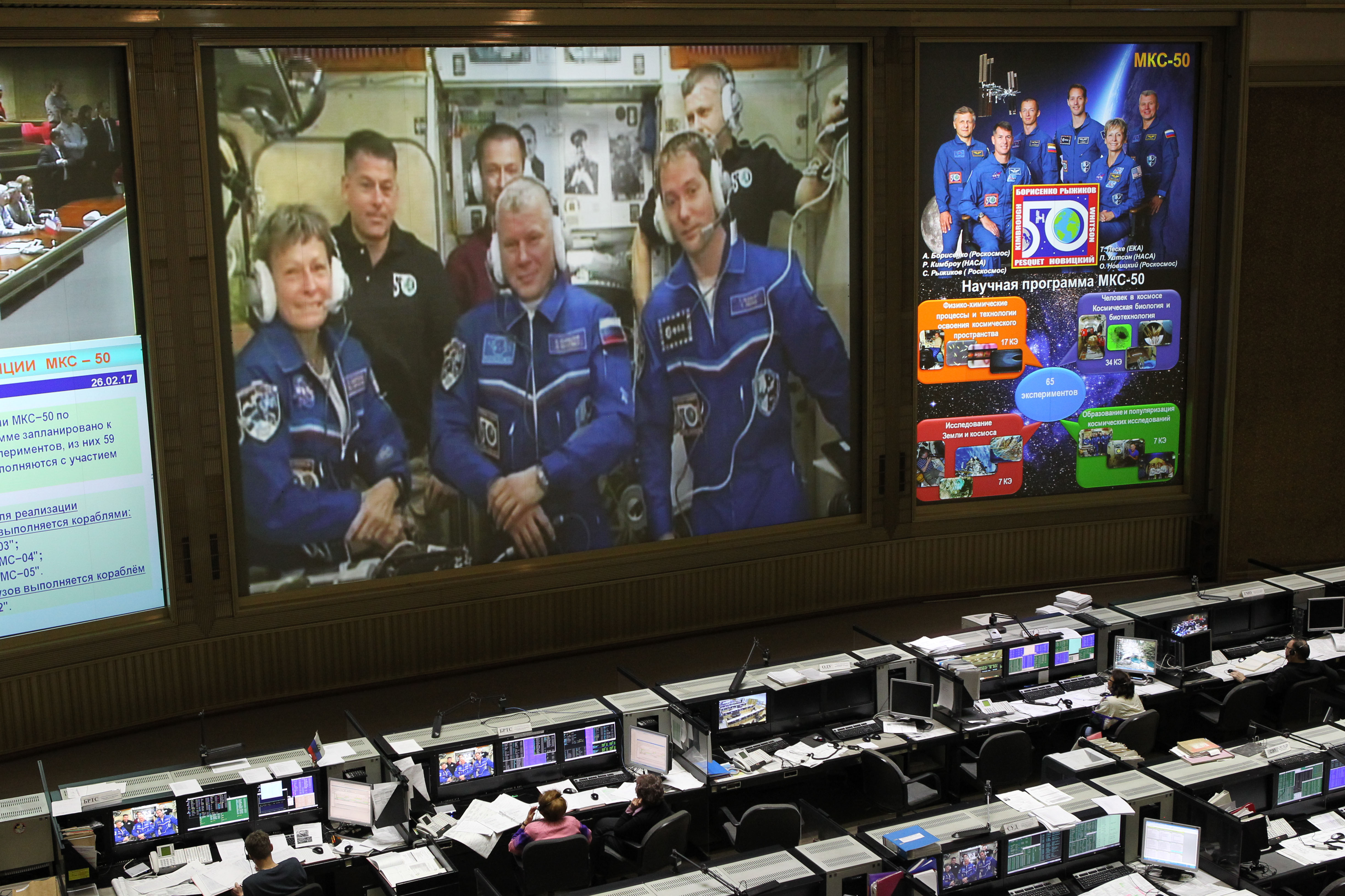 On the front screen in the cavernous control room at the Russian Mission Control Center in Korolev, Russia, the Expedition 50 crewmembers receive congratulatory calls from friends and family Nov. 20 following the arrival of Peggy Whitson of NASA, Oleg Novitskiy of the Russian Federal Space Agency (Roscosmos) and Thomas Pesquet of the European Space Agency at the International Space Station on the Soyuz MS-03 spacecraft. Hatches opened between the Soyuz and the station about two and a half hours after the Soyuz docked to the complex. NASA/Stephanie Stoll