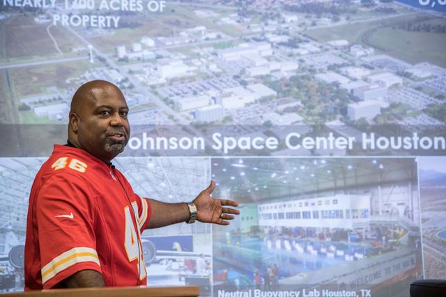 jsc2017e009635 (01/26/2017) --- Former NFL player Daryl Gaines (K.C. Chiefs) briefs a large group of former NFL players on the Johnson Space Center’s (JSC) many missions during the JSC Super Bowl Tailgate event. Daryl is currently assistant to the Center Director of JSC and is a member of the JSC Super Bowl Committee collaborating between JSC and the Houston NFL Super Bowl Committee to plan joint activities for JSC participation in Super Bowl LI. Center Director Ellen Ochoa invited the former NFL players to JSC as part of our Super Bowl Live events. During the week before the Super Bowl the former players visited Mission Control, and other JSC areas taking time to stop and give autographs and photo opportunities to JSC Staff members. NASA POTOGRAPHER Lauren Harnett.