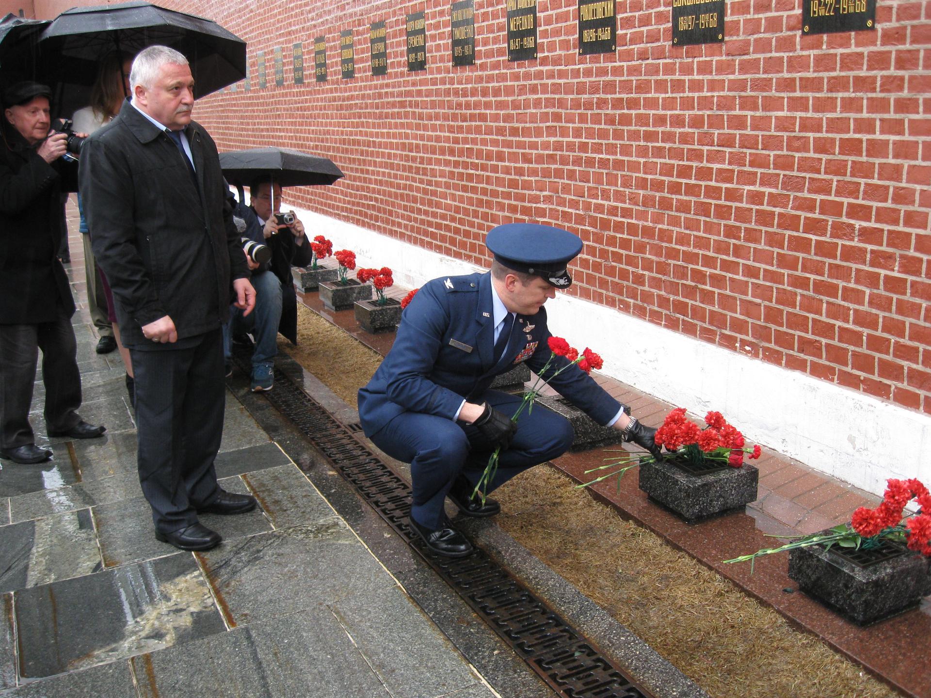 jsc2017e039459 (04/03/2017) --- At the Kremlin Wall in Red Square in Moscow, Expedition 51 crewmember Jack Fischer of NASA lays flowers at the site where Russian space icons are interred during traditional ceremonies April 3. Fischer and Fyodor Yurchikhin of the Russian Federal Space Agency (Roscosmos) will launch April 20 on the Soyuz MS-04 spacecraft from the Baikonur Cosmodrome in Kazakhstan for a four and a half month mission on the International Space Station. Photo: NASA/Rob Navias.