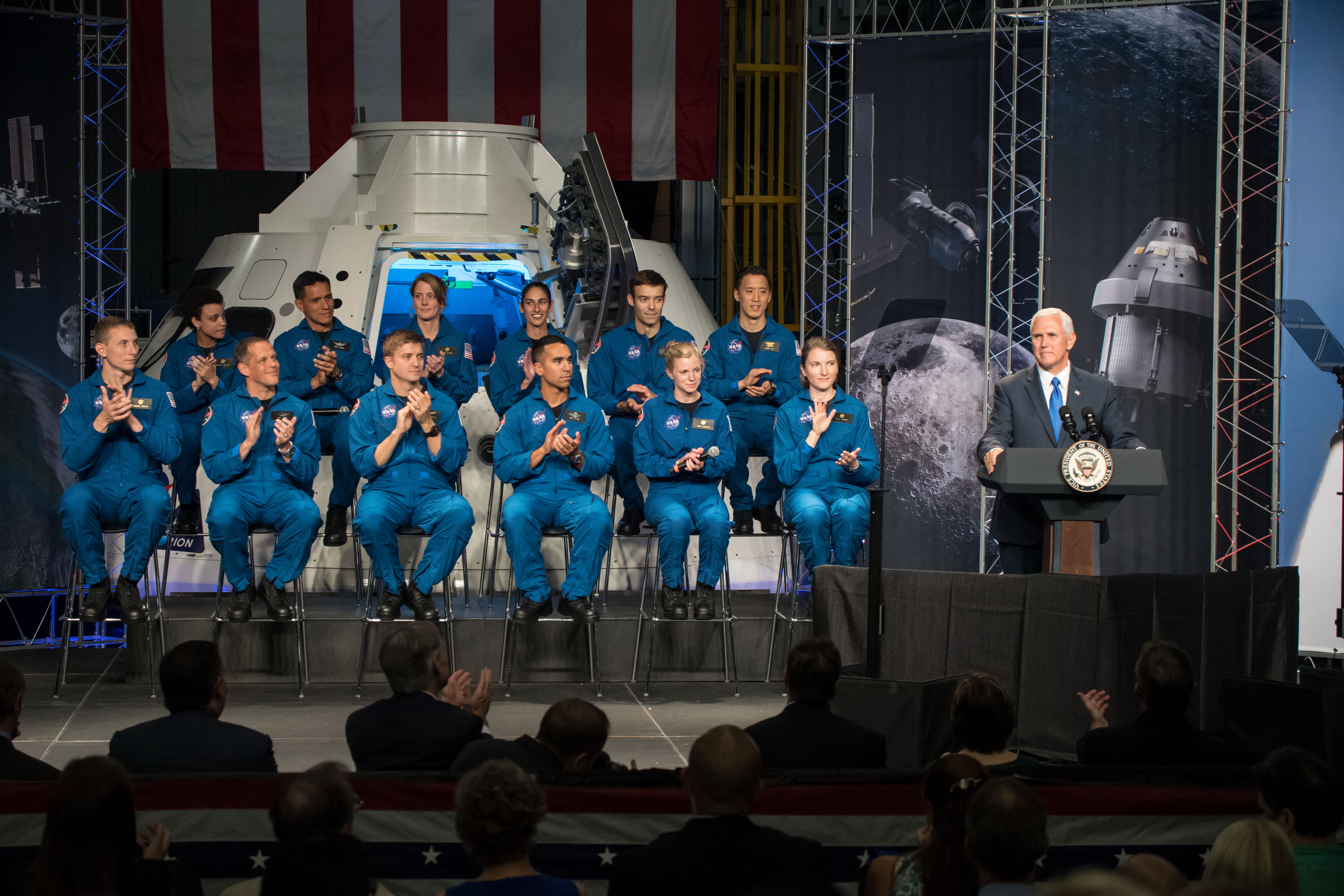 jsc2017e067166 (06/07/2017) --- United States Vice President Mike Pence congratulates NASA's 12 new astronaut candidates at the agency's Johnson Space Center in Houston. The 2017 astronaut candidate class -- Kayla Barron, Zena Cardman, Raja Chari, Matthew Dominick, Bob Hines, Warren “Woody” Hoburg, Jonathan Kim, Robb Kulin, Jasmin Moghbeli, Loral O’Hara, Francisco Rubio and Jessica Watkins – were chosen from amid a record number of people applying. Photo Credit: (NASA/James Blair)