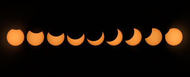 jsc2017e111180 (Aug. 21, 2017) --- Employees at NASA’s Johnson Space Center in Houston joined the rest of the country in experiencing the 2017 eclipse on Aug. 21, 2017. This composite image was made of nine separate photographs captured in the duration of the eclipse. In Houston, the partial eclipse duration was 2 hours, 59 minutes, reaching its maximum level of 70 percent at 1:16 p.m. CDT.