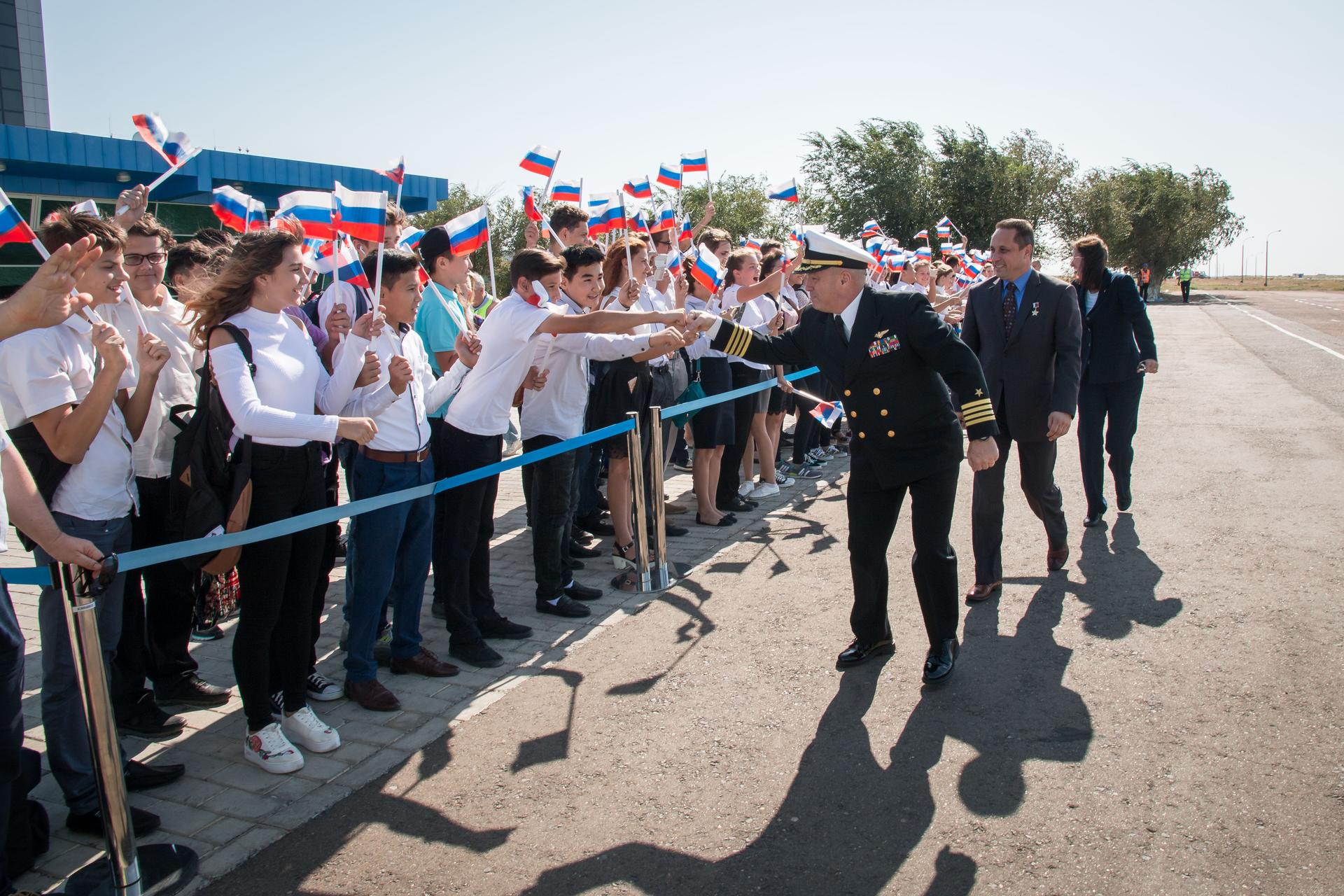 jsc2017e114752 (Sept. 6, 2017) --- Expedition 53-54 backup crewmembers Scott Tingle of NASA (foreground), Anton Shkaplerov of Roscosmos (center), and Shannon Walker of NASA are greeted by local students after arriving at the launch site at the Baikonur Cosmodrome in Kazakhstan Sept. 6 after a flight from their training base in Star City, Russia for final pre-launch training. They are serving as backups to the prime crew, Alexander Misurkin of Roscosmos and Joe Acaba and Mark Vande Hei of NASA, who will launch Sept. 13 on the Soyuz MS-06 spacecraft from the Baikonur Cosmodrome for a five and a half month mission on the International Space Station. Credit: NASA/Victor Zelentsov