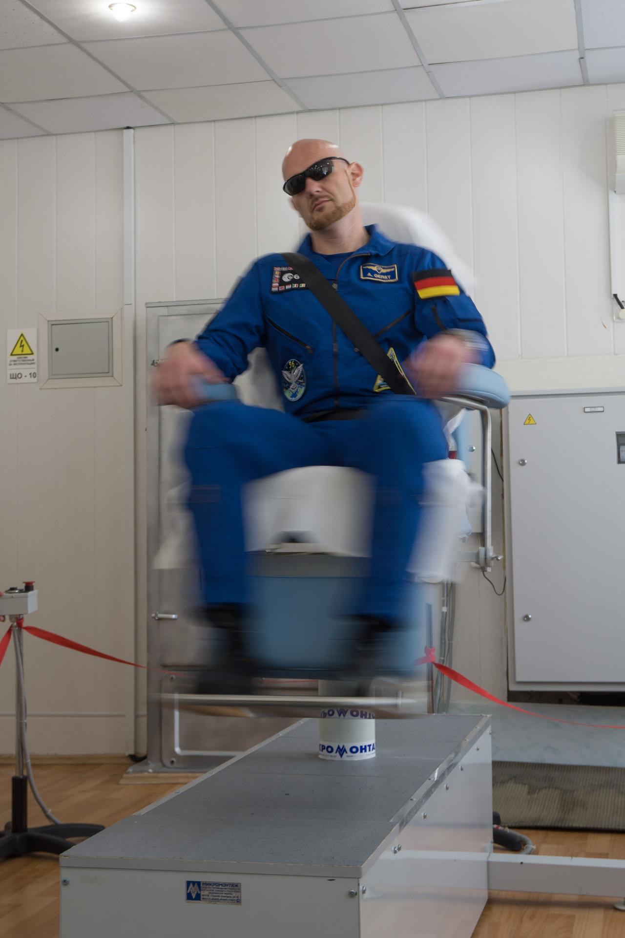 jsc2018e050828 - At the Cosmonaut Hotel crew quarters in Baikonur, Kazakhstan, Expedition 56 prime crewmember Alexander Gerst of the European Space Agency takes a spin in a rotating chair May 29 to test his vestibular system as part of pre-launch activities. Gerst, Serena Aunon-Chancellor of NASA and Sergey Prokopyev of Roscosmos will launch June 6 from the Baikonur Cosmodrome in Kazakhstan on the Soyuz MS-09 spacecraft for a six-month mission on the International Space Station...NASA/Victor Zelentsov.