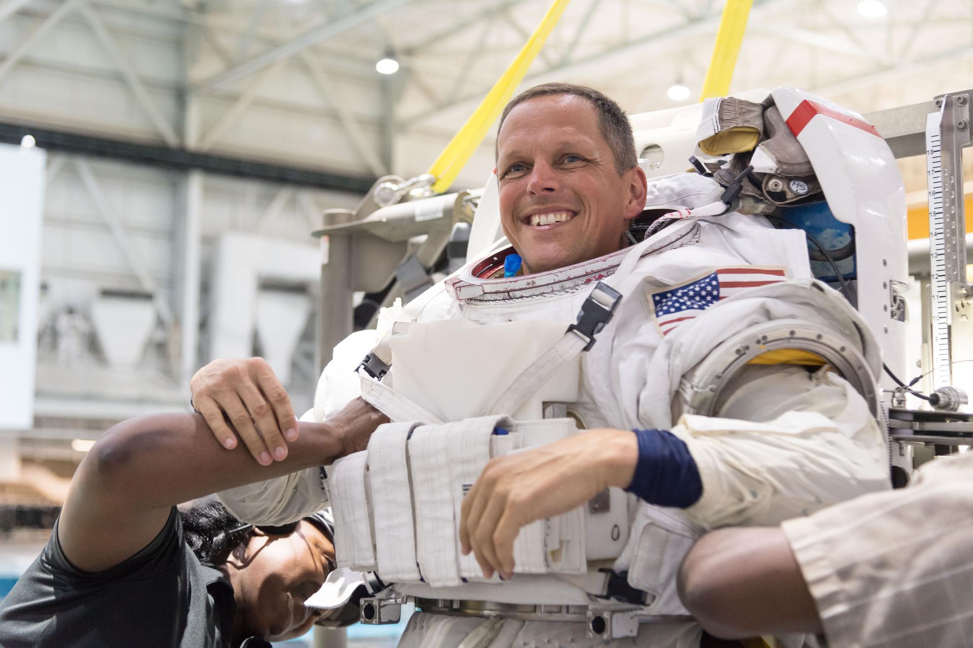 jsc2018e064795 (07/18/2018) --- 2017 NASA astronaut candidate Bob Hines is being helped into a spacesuit prior to underwater spacewalk training at NASA Johnson Space Center’s Neutral Buoyancy Laboratory in Houston. Photo Credit: (NASA/Norah Moran)