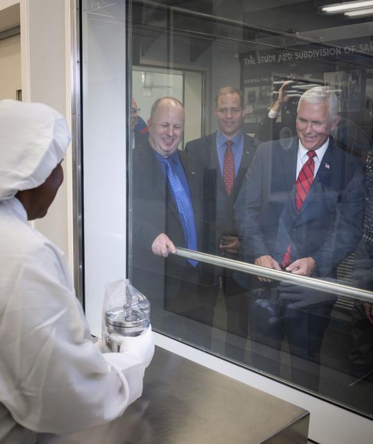 jsc2018e076655 (Aug. 23, 2018) --- Vice President Mike Pence visited NASA’s Johnson Space Center in Houston on Aug. 23, 2018, to discuss the future of space exploration and other elements of human spaceflight. During his trip to the Johnson Space Center, the Vice President also toured the laboratory housing the moon rocks retrieved during the Apollo program’s lunar missions and extraterrestrial samples from other uncrewed sample return missions. Apollo Lunar Sample Principle Scientist Andrea Mosie held a lunar sample up for inspection by the Vice President, who was joined in the viewing room behind protective glass by Apollo Lunar Sample Curator Ryan Ziegler.