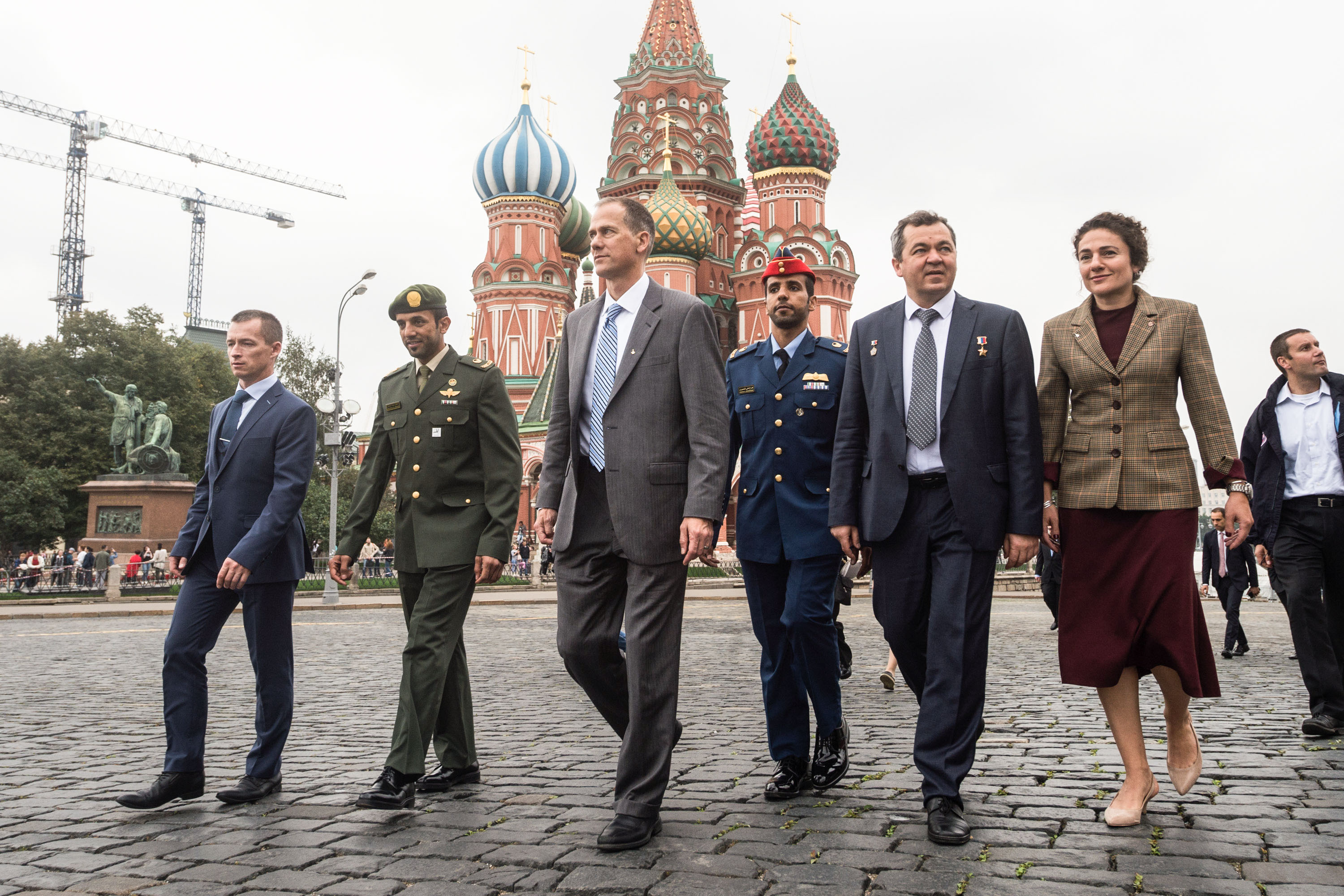 jsc2019e052236 - With St. Basil’s Cathedral serving as a backdrop, the next crew to launch to the International Space Station and their backups walk through Red Square in Moscow Sept. 5 as part of traditional pre-launch activities. From right to left are Expedition 61 crewmembers Jessica Meir of NASA and Oleg Skripochka of Roscosmos, spaceflight participant Hazzaa Ali Almansoori of the United Arab Emirates and backups, Tom Marshburn of NASA, Sultan Al-Neyadi of the United Arab Emirates and Sergey Ryzhikov of Roscosmos. Meir, Skripochka and Almansoori will launch Sept. 25 from the Baikonur Cosmodrome in Kazakhstan on the Soyuz MS-15 spacecraft for a mission on the International Space Station...Andrey Shelepin/Gagarin Cosmonaut Training Center.