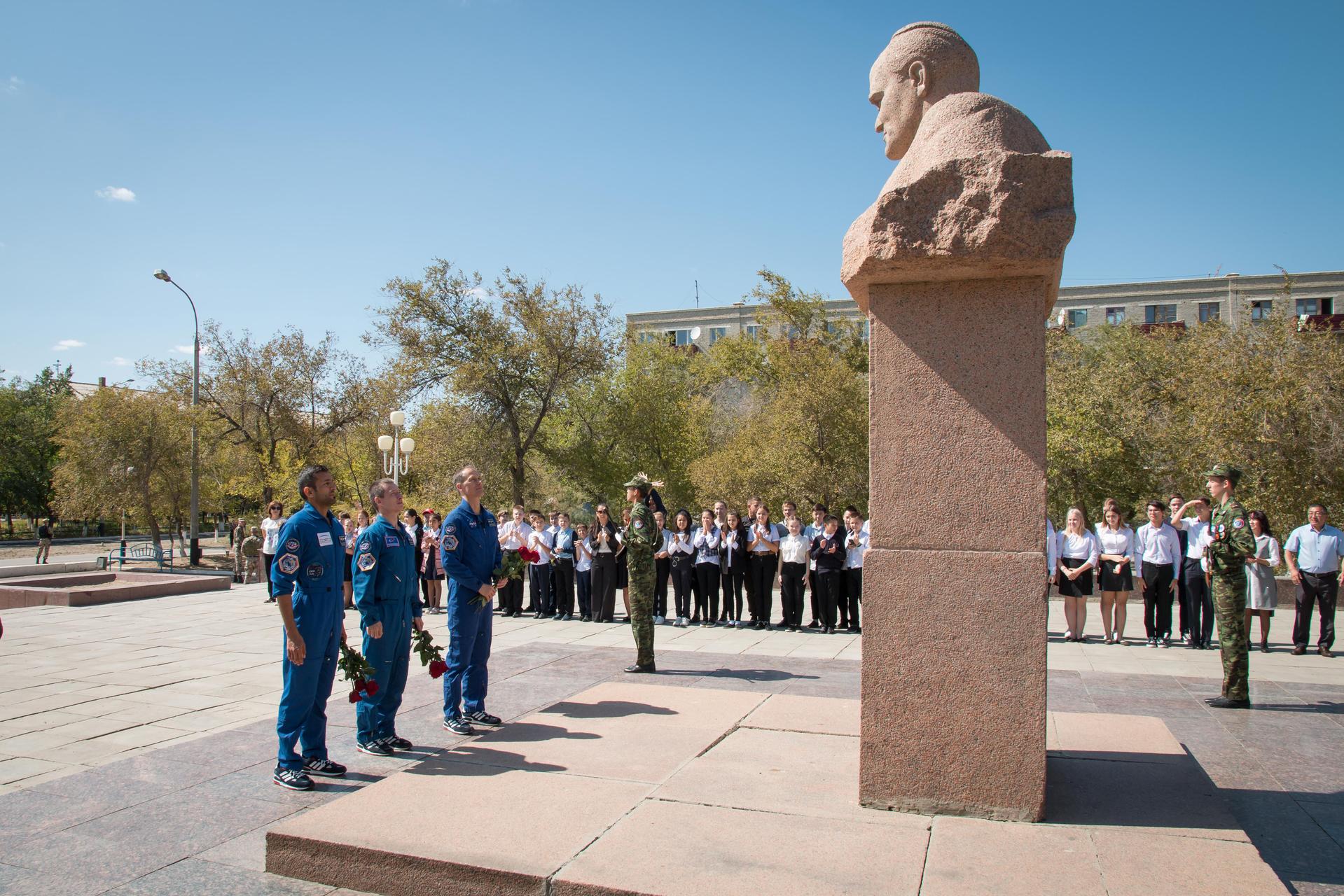 jsc2019e052905 - In the town of Baikonur, Kazakhstan, the backup crewmembers for the next launch to the International Space Station pay tribute Sept. 12 at a statue of Sergei Korolev, the Russian great designer, as part of traditional pre-launch activities. Backup spaceflight participant Sultan Al-Neyadi of the United Arab Emirates (left), Sergey Ryzhikov of Roscosmos (center) and Tom Marshburn of NASA (right) are the backups to the prime Expedition 61 crew, Oleg Skripochka of Roscosmos and Jessica Meir of NASA and spaceflight participant Hazzaa Ali Almansoori of the United Arab Emirates, who will launch Sept. 25 on the Soyuz MS-15 spacecraft for a mission on the International Space Station...NASA/Victor Zelentsov.