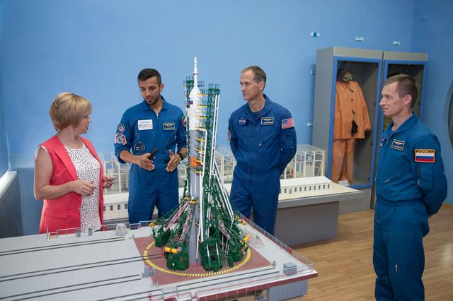 jsc2019e052907 - At the Baikonur Museum in the town of Baikonur, Kazakhstan, the backup crewmembers for the next launch to the International Space Station discuss the workings of a Soyuz launch pad Sept. 12 with a museum official during a traditional pre-launch tour. Spaceflight participant Sultan Al-Neyadi of the United Arab Emirates (left), Tom Marshburn of NASA (center) and Sergey Ryzhikov of Roscosmos (right) are the backups to the prime Expedition 61 crew, Oleg Skripochka of Roscosmos and Jessica Meir of NASA and spaceflight participant Hazzaa Ali Almansoori of the United Arab Emirates, who will launch Sept. 25 on the Soyuz MS-15 spacecraft for a mission on the International Space Station...NASA/Victor Zelentsov.