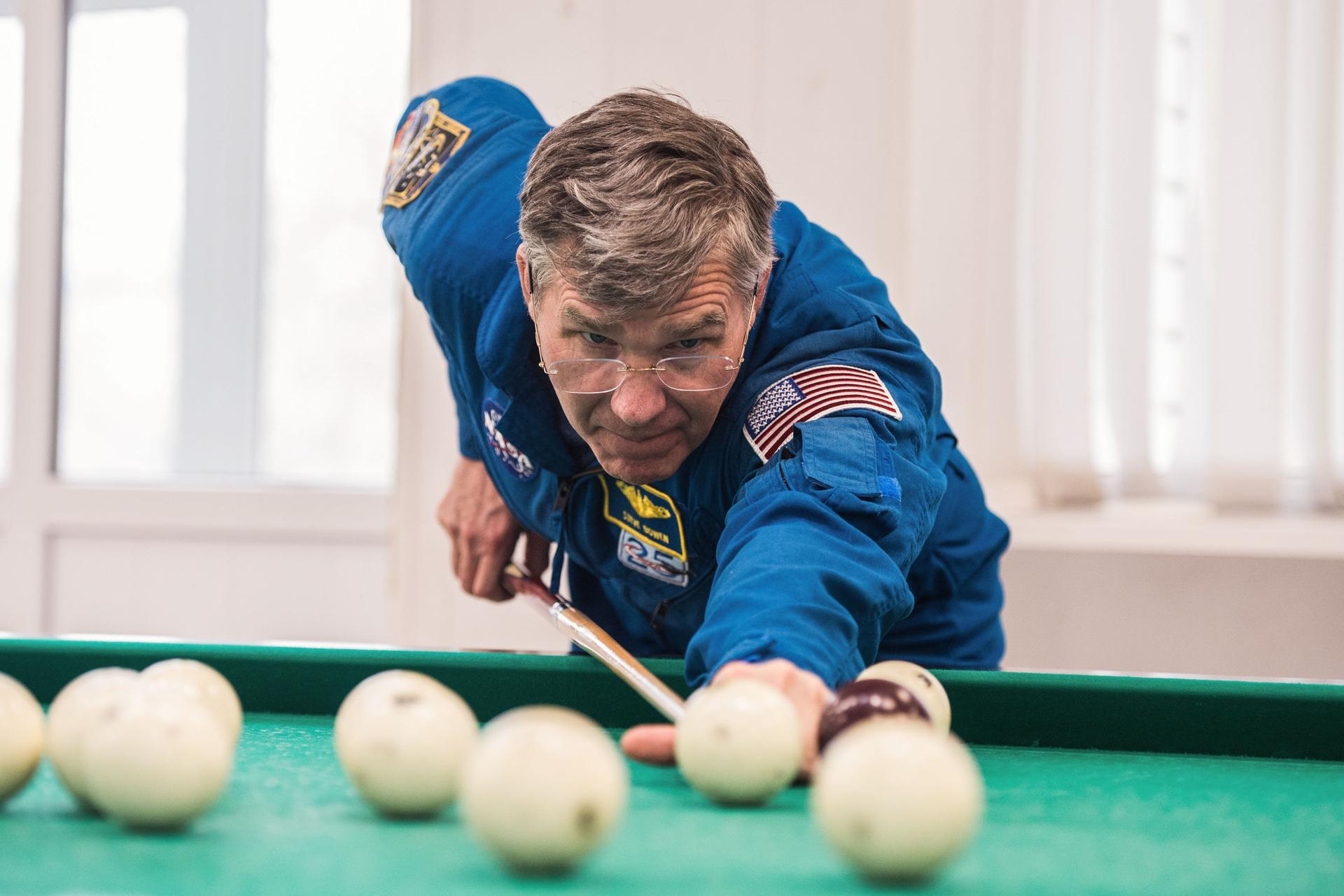 jsc2020e016959 - At the Cosmonaut Hotel crew quarters in Baikonur, Kazakhstan, Expedition 63 backup crewmember Steve Bowen of NASA plays a game of billiards April 1 as he takes a break from pre-launch training. Bowen and Sergey Ryzhikov and Andrei Babkin of Roscosmos are the backups to the prime crew, Chris Cassidy of NASA and Anatoly Ivanishin and Ivan Vagner of Roscosmos, who will launch April 9 on the Soyuz MS-16 spacecraft from the Baikonur Cosmodrome in Kazakhstan for a six-and-a-half month mission on the International Space Station...Andrey Shelepin/Gagarin Cosmonaut Training Center.