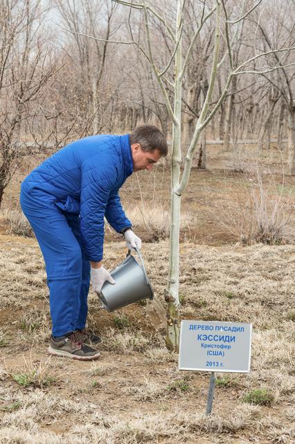 jsc2020e016974 - At the Cosmonaut Hotel crew quarters in Baikonur, Kazakhstan, Expedition 63 crewmember Chris Cassidy of NASA waters a tree bearing his name April 1 in a traditional pre-launch activity. Cassidy and Anatoly Ivanishin and Ivan Vagner of Roscosmos will launch April 9 on the Soyuz MS-16 spacecraft from the Baikonur Cosmodrome in Kazakhstan for a six-and-a-half month mission on the International Space Station...Andrey Shelepin/Gagarin Cosmonaut Training Center..