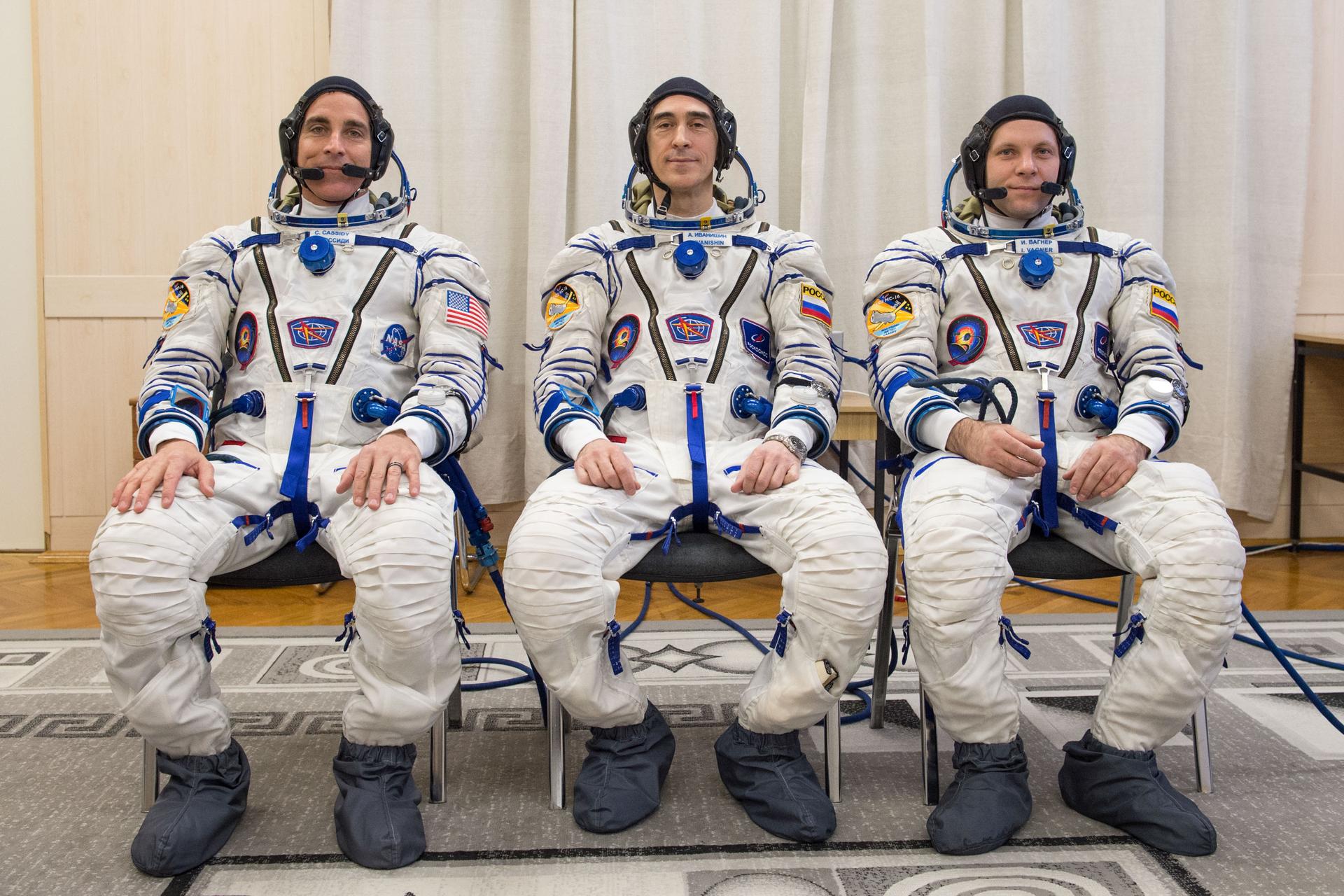 jsc2020e017082 - Expedition 63 Preflight - Expedition 63 crewmember Chris Cassidy of NASA, left, Anatoly Ivanishin of Roscosmos, center, and Ivan Vagner of Roscosmos pose for a group photo after suiting up and preparing for leak checks of their launch and entry suits at the Baikonur Cosmodrome in Kazakhstan as they prepared for launch Thursday, April 9, 2020 on the Soyuz MS-16 spacecraft. A few hours later, they lifted off for a six-and-a-half month mission on the International Space Station. Photo Credit: (NASA/GCTC/Andrey Shelepin)