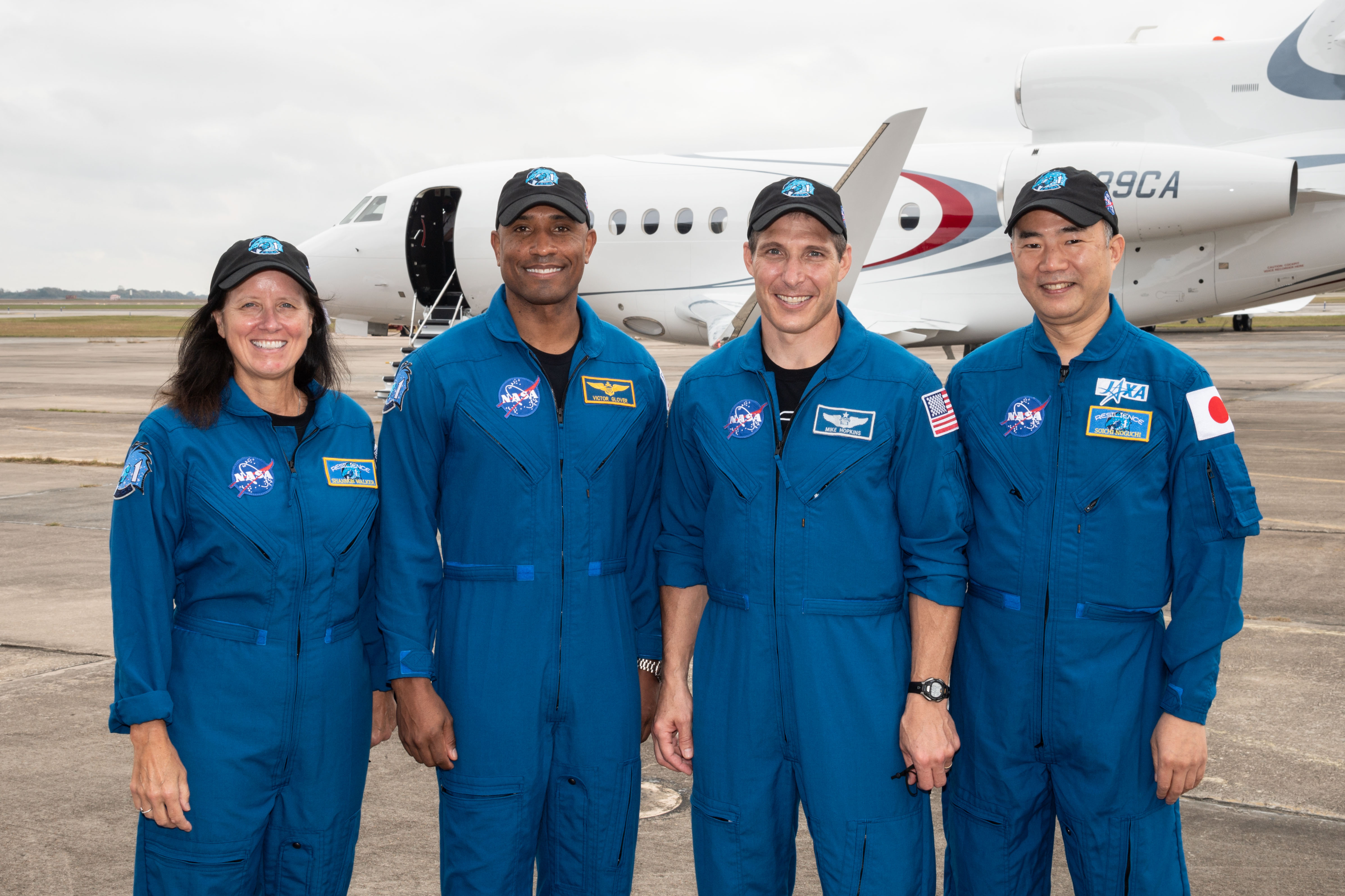 From left, NASA astronauts Shannon Walker, Victor Gover and Michael Hopkins, along with Soichi Noguchi of the Japan Aerospace Exploration Agency (JAXA), board a plane from Ellington Field near the agency’s Johnson Space Center in Houston, Texas, en route to Kennedy Space Center in Florida for NASA’s SpaceX Crew-1 mission to begin final launch preparations. Crew-1 is the first operational mission of the SpaceX Crew Dragon spacecraft and Falcon 9 rocket to the International Space Station as part of the agency’s Commercial Crew Program.
