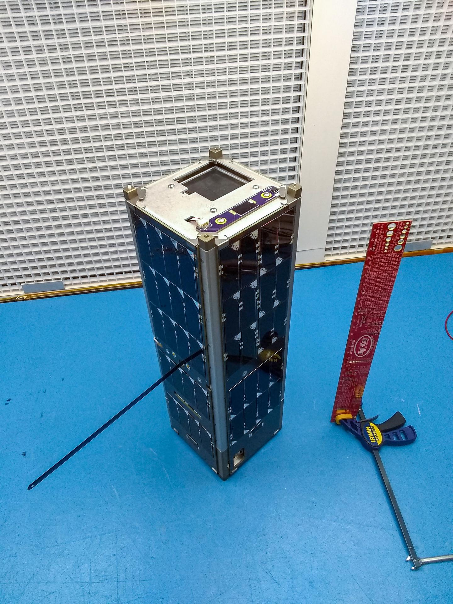 jsc2021e007965 (9/28/2020) --- The IT-SPINS 3U CubeSat showing the CTIP instrument aperture at long end. The Ionosphere Thermosphere Scanning Photometer for Ion-Neutral Studies (IT-SPINS) produces two-dimensional (2D) tomographic imaging of Earth’s ionosphere in order to increase fundamental understanding of its structure. Photo courtesy of Montana State University.