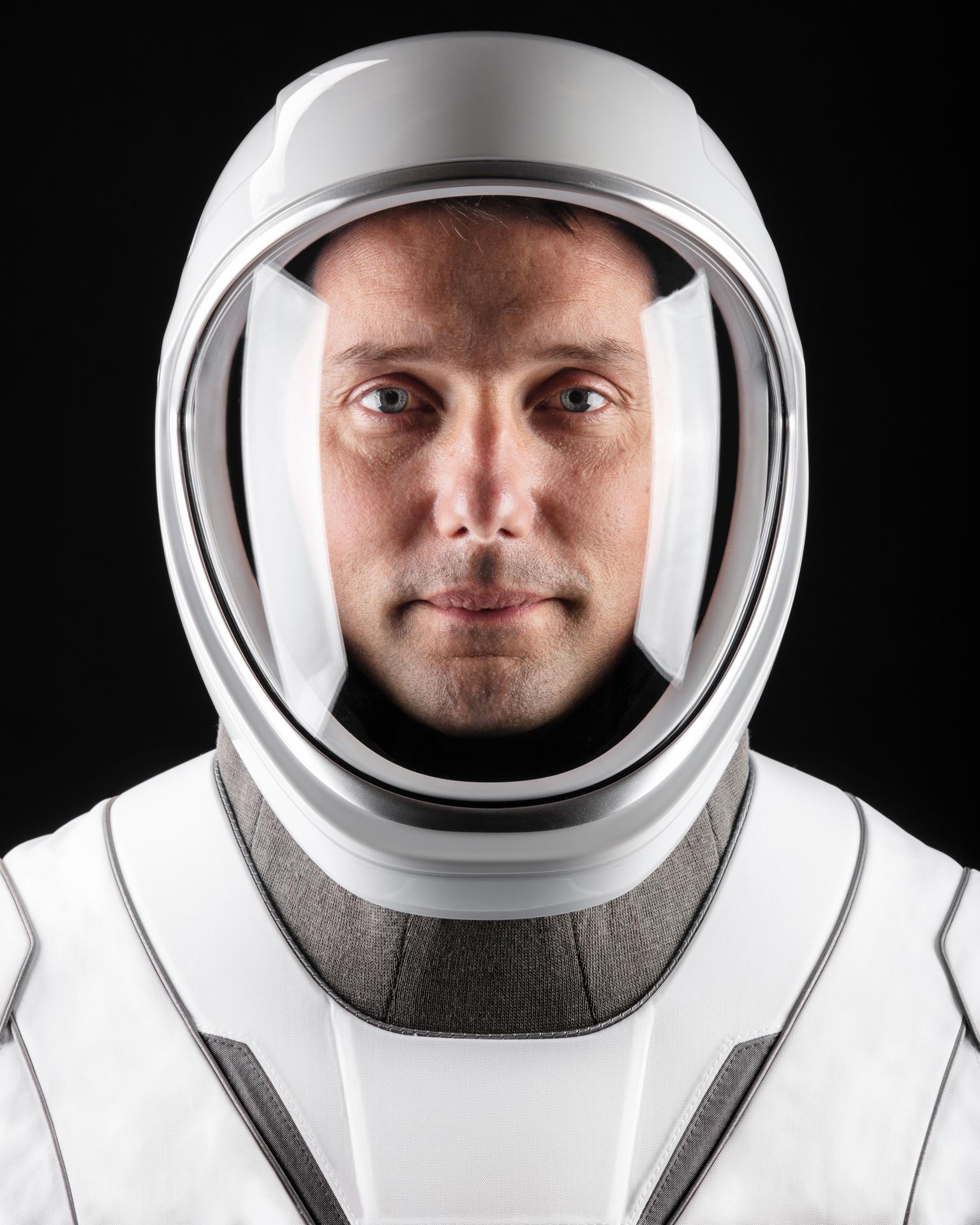 jsc2021e010826 (March 24, 2021) --- Astronaut Thomas Pesquet of ESA (European Space Agency), SpaceX Crew-2 Mission Specialist, poses for a portrait in his pressure suit at SpaceX headquarters in Hawthorne, California. Credit: SpaceX