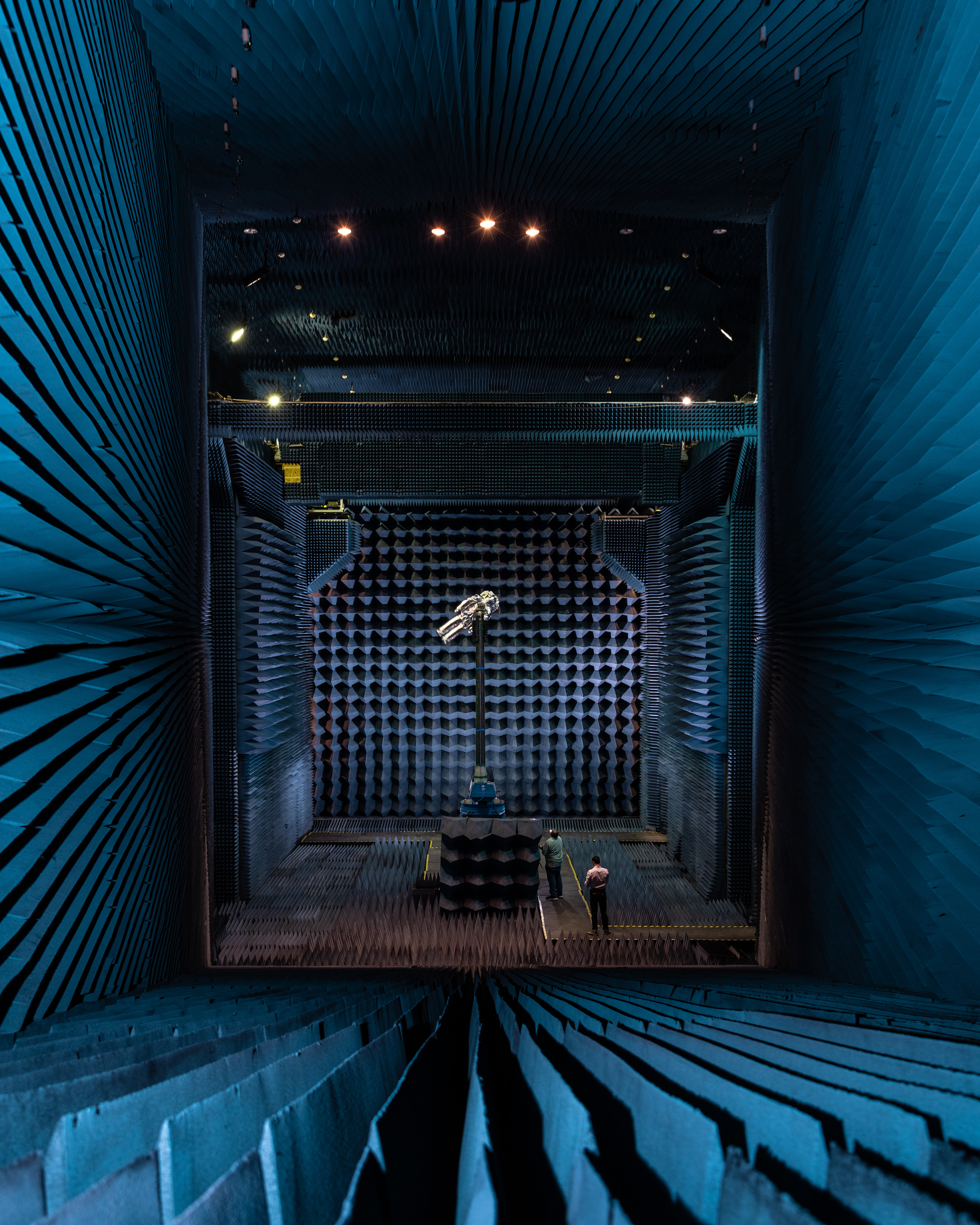 xEMU Antenna testing being performed in the B14 Anechoic Chamber to inspect MLI keep out zones for the antennas. The xEMU Test article is named xGUS, the successor to the EMU Test Article also named GUS (named after Gus Grissom and his iconic silver spacesuit). Image taken from where "horn" is located that sends out radio frequency signals for test. Photographer: Norah Moran – Johnson Space Center