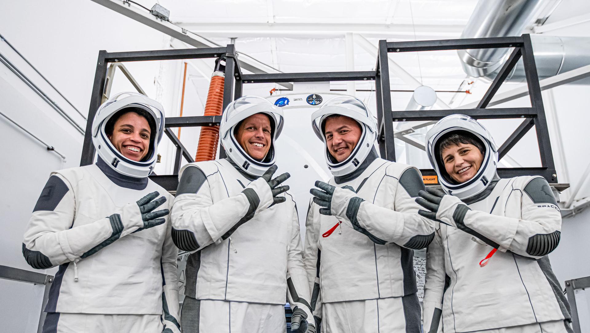 jsc2022e003339 (Nov. 28, 2021) --- NASA’s SpaceX Crew-4 astronauts participate in a training session at SpaceX headquarters in Hawthorne, CA. From left to right: NASA astronaut and SpaceX Crew-4 mission specialist Jessica Watkins; NASA astronaut and SpaceX Crew-4 pilot Robert “Bob” Hines; NASA astronaut and SpaceX Crew-4 commander Kjell Lindgren; and ESA (European Space Agency) astronaut and Crew-4 mission specialist Samantha Cristoforetti of Italy.