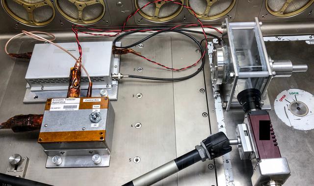 jsc2022e004237 (11/8/2021) --- A Preflight image of the Acoustics to Manipulate Fluids investigation, the acoustic tweezer apparatus is installed inside the Microgravity Science Glovebox Engineering Unit. The sample chamber, shown in the upper the right side, is where fluid droplets are injected via a septum located on the right side and manipulated by an ultrasonic transducer located on the left side. Image courtesy of Dr. Robert Lirette.