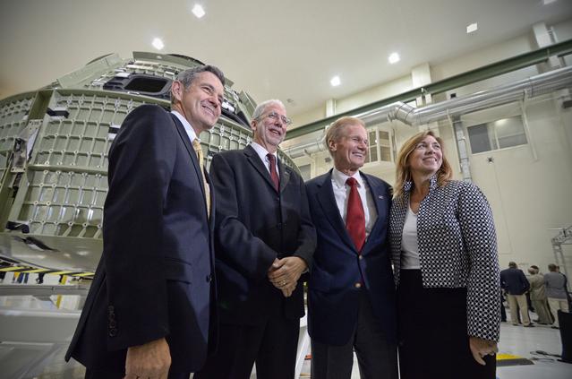 The Orion crew module pressure vessel for Exploration Flight Test-1 (EFT-1) is unveiled at a ceremony at the Operations and Checkout (O&C) Building at NASA’s Kennedy Space Center in Florida on July 2, 2012. Orion Program Manager Mark Geyer and KSC Center Director Robert Cabana pose for photo. Part of Batch image transfer from Flickr.