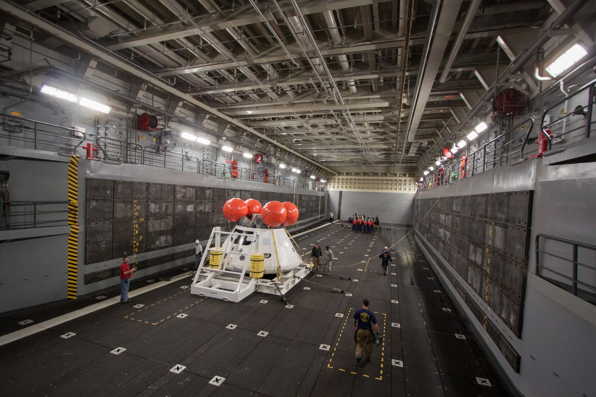 The Orion boilerplate test vehicle is secured in the well deck of the USS San Diego at the U.S. Naval Base San Diego in California on Feb. 20, 2014. Orion was transported about 100 miles offshore for an underway recovery test. NASA and the U.S. Navy conducted tests to prepare for recovery of the Orion crew module, forward bay cover and parachutes on its return from a deep space mission. The underway recovery tests allow the teams to demonstrate and evaluate the recovery processes, procedures, hardware and personnel in open waters. Part of Batch image transfer from Flickr.