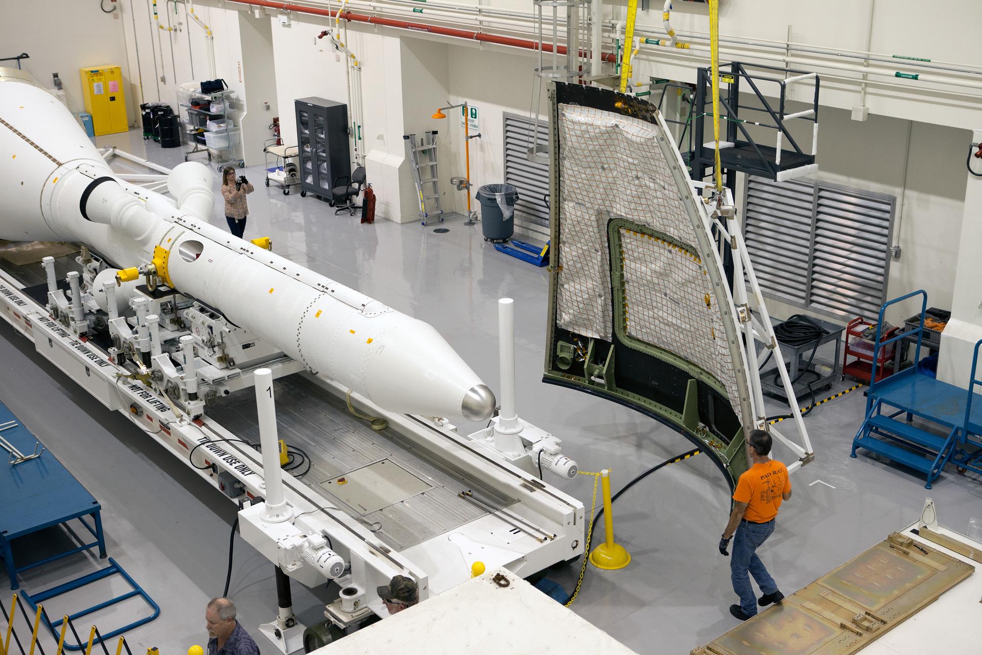 The launch abort system ogive panels are prepared for installation onto the Orion Exploration Flight Test-1 (EFT-1) launch abort system in the Launch Abort System Facility (LASF) at Kennedy Space Center on April 16, 2014. Part of Batch image transfer from Flickr.