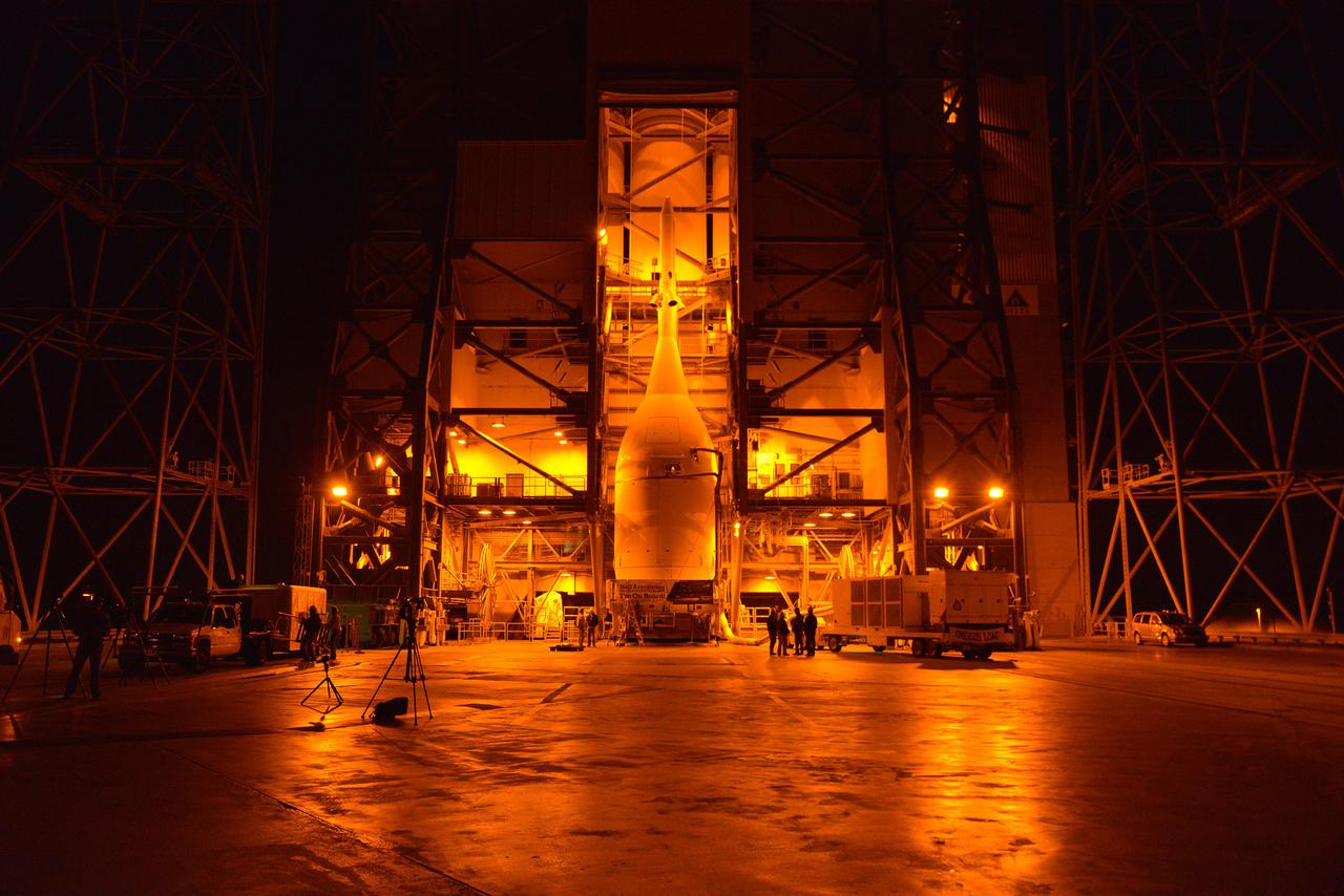 Engineers and technicians at Space Launch Complex 37 move Orion into place in the service structure so the spacecraft can be lifted and joined to the top of the Delta IV Heavy rocket on Nov. 12, 2014. Part of Batch image transfer from Flickr.