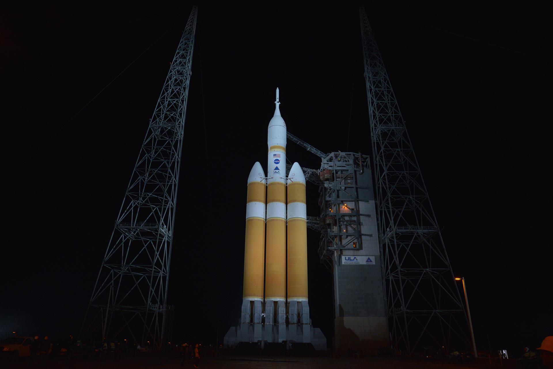 The full United Delta IV Heavy with Orion on top is revealed on Dec. 3, 2014 as the mobile service tower is rolled back in preparation for the 7:05 am Exploration Flight Test-1 (EFT-1) launch. Part of Batch image transfer from Flickr.