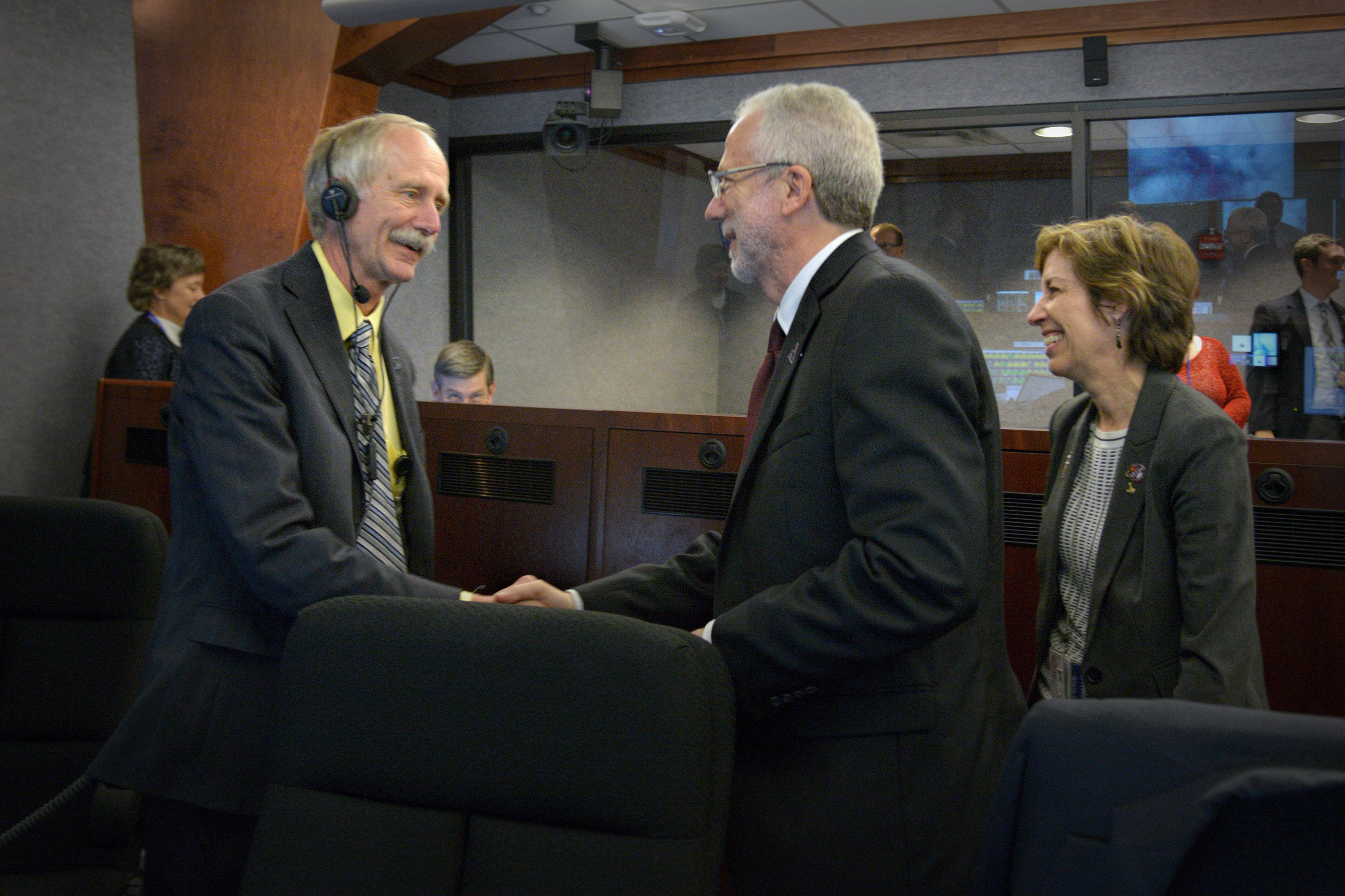 The Orion team celebrates Orion's successful Exploration Flight Test-1 (EFT-1) mission in Building AE at Cape Canaveral Air Force Station on Dec. 5, 2014. Orion Program Manager Mark Geyer, NASA Director Ellen Ochoa and NASA Associate Administrator for the Human Exploration and Operations Directorate William Gerstenmaier are in frame. The Orion spacecraft orbited Earth twice, reaching an altitude of approximately 3,600 miles above Earth before landing. No one was aboard Orion for this flight test, but the spacecraft is designed to allow us to journey to destinations never before visited by humans, including an asteroid and Mars. Part of Batch image transfer from Flickr.