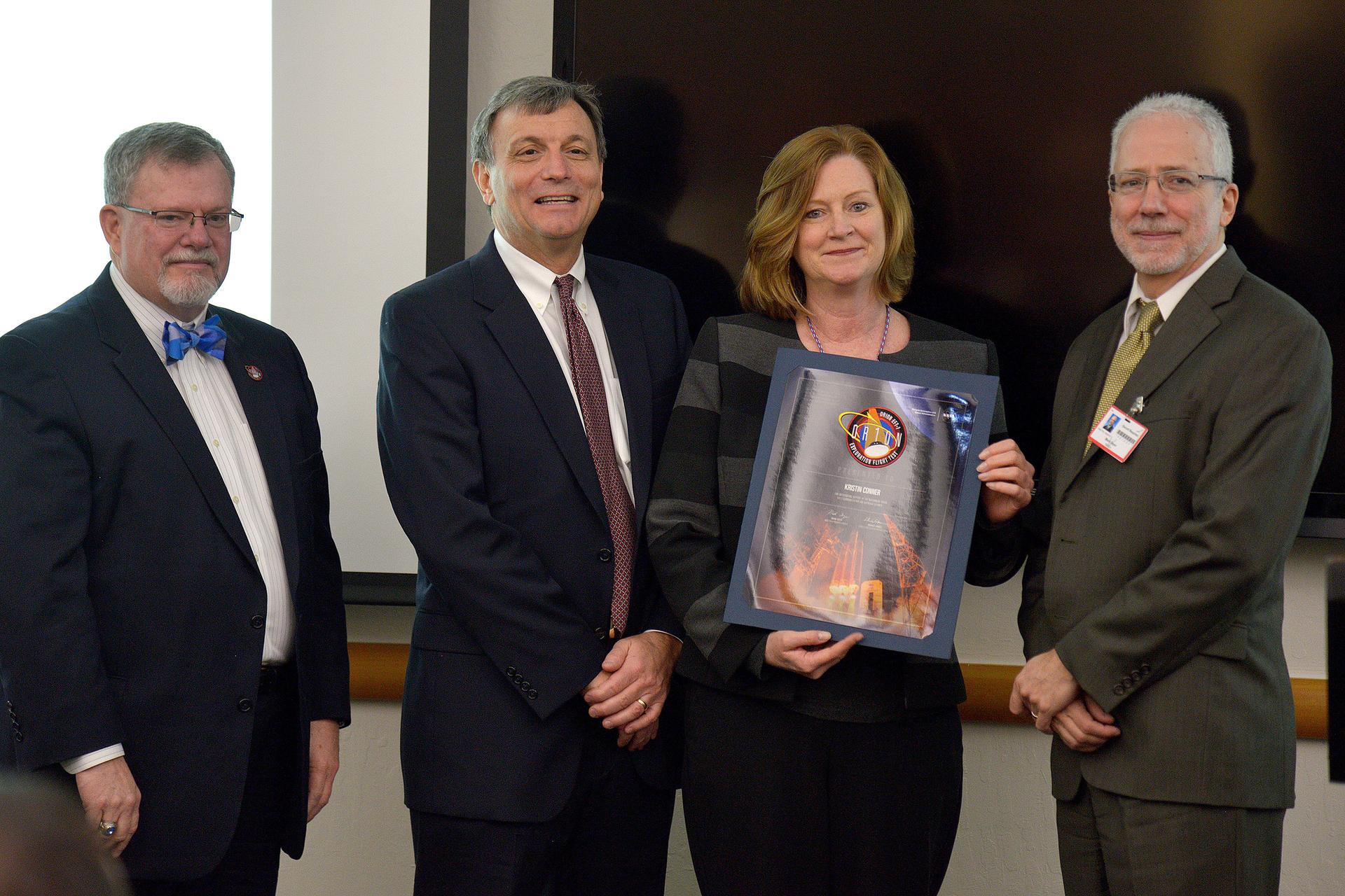 Orion leadership (including Orion Program Manager Mark Geyer) visits Aerojet Rocketdyne in Sacramento, CA on March 3, 2015 to recognize the great work performed in support of Orion's first flight, Exploration Flight Test-1 (EFT-1). Award presented to Kristin Conner. Part of Batch image transfer from Flickr.