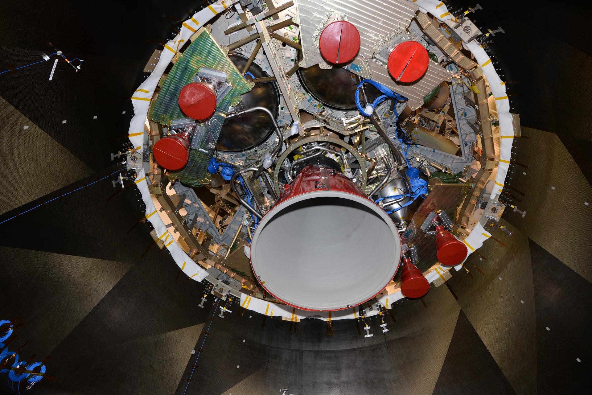 The European Service Module structural test model, shown on Jan. 23, 2016, is used for testing purposes before installing the real thing. It is as close to the flight version as possible while keeping costs and development time manageable. The structure and weight are the same, while mass equivalents stand in for electronics boxes not needed for the series of tests...The model was installed under a test version of the Crew Module Adapter, and sits on the Spacecraft Adapter that will attach Orion to its launch vehicle. This is the first time the European hardware has been physically connected to NASA’s elements...The service module will be shaken at NASA’s Plum Brook station in Sandusky, Ohio, USA, to recreate the vibrations of launch, as well as being subjected to acoustic and shock environments. Part of Batch image transfer from Flickr.