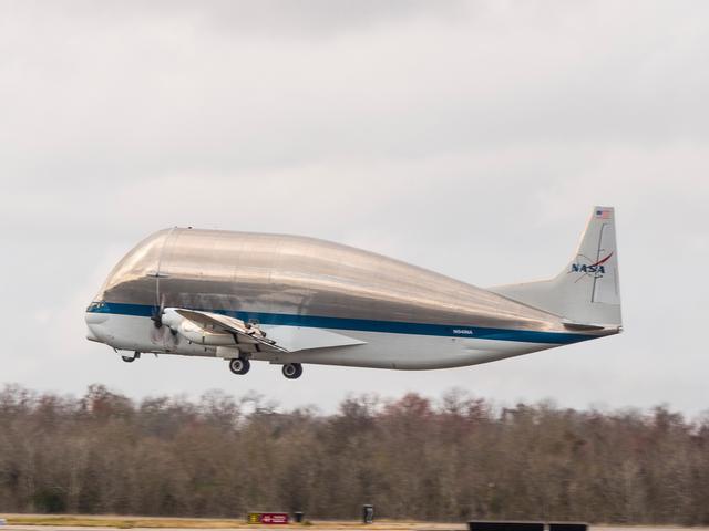 NASA's Super Guppy, carrying the Artemis I Orion crew module pressure vessel, departs New Orleans en route to Kennedy Space Center in Florida on Feb. 1, 2016. Part of Batch image transfer from Flickr.