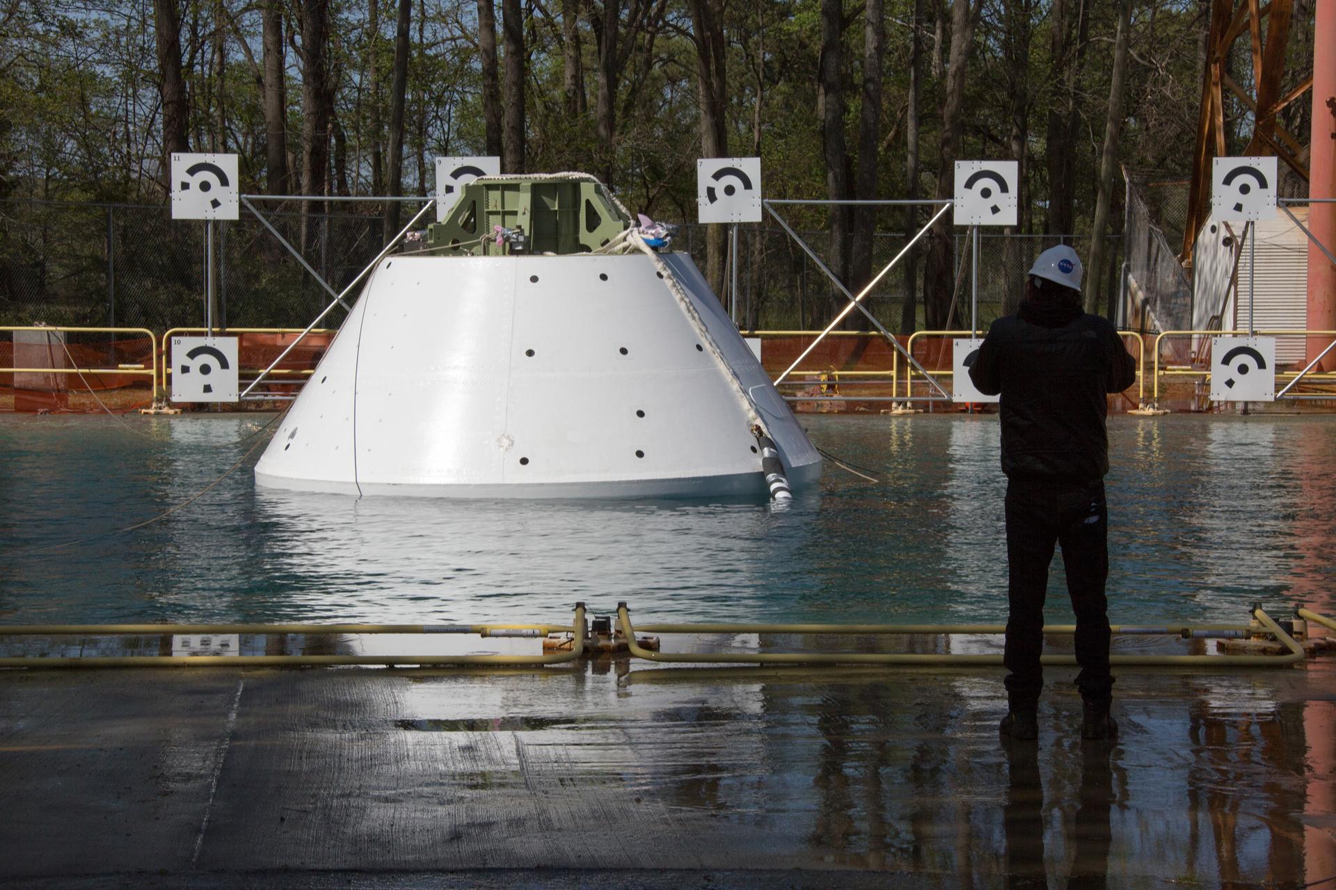 On April 6, 2016, engineers at NASA’s Langley Research Center in Hampton, Virginia, kicked off a series of nine drop tests of a representative Orion crew capsule with crash test dummies inside to understand what the spacecraft and astronauts may experience when landing in the Pacific Ocean after deep-space missions. The high-fidelity capsule, coupled with the heat shield from Orion's first flight in space, was hoisted approximately 16 feet above the water and vertically dropped into Langley’s 20-foot-deep Hydro Impact Basin. The crash test dummies were instrumented to provide data and secured inside the capsule to help provide information engineers need to ensure astronauts will be protected from injury during splashdown. Each test in the series simulates different scenarios for Orion’s parachute-assisted landings, wind conditions, velocities and wave heights the spacecraft may experience when touching down in the ocean.