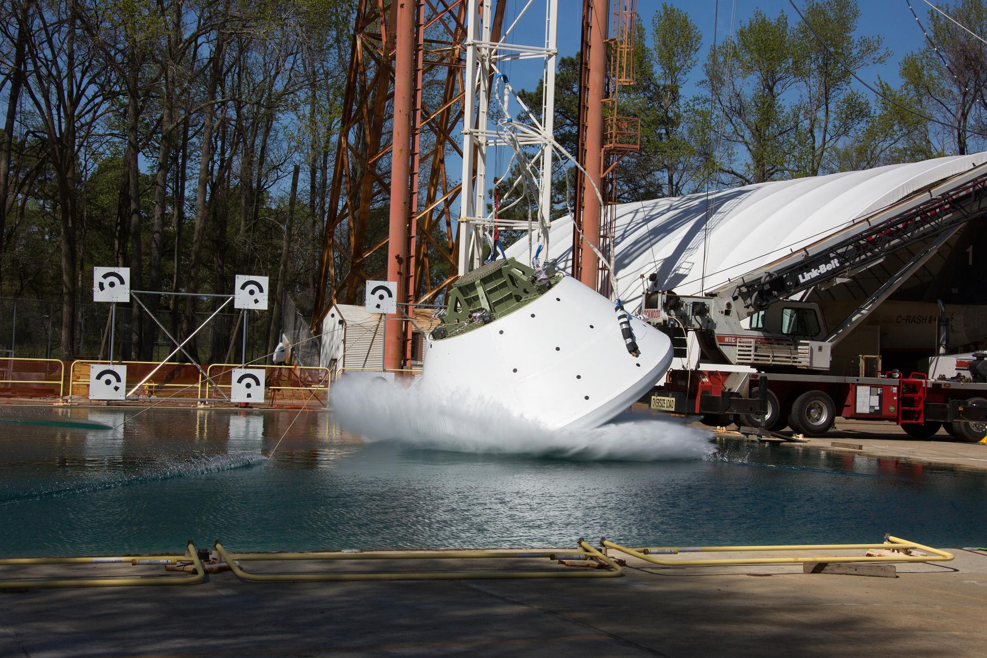 On April 6, 2016, engineers at NASA’s Langley Research Center in Hampton, Virginia, kicked off a series of nine drop tests of a representative Orion crew capsule with crash test dummies inside to understand what the spacecraft and astronauts may experience when landing in the Pacific Ocean after deep-space missions. The high-fidelity capsule, coupled with the heat shield from Orion's first flight in space, was hoisted approximately 16 feet above the water and vertically dropped into Langley’s 20-foot-deep Hydro Impact Basin. The crash test dummies were instrumented to provide data and secured inside the capsule to help provide information engineers need to ensure astronauts will be protected from injury during splashdown. Each test in the series simulates different scenarios for Orion’s parachute-assisted landings, wind conditions, velocities and wave heights the spacecraft may experience when touching down in the ocean.