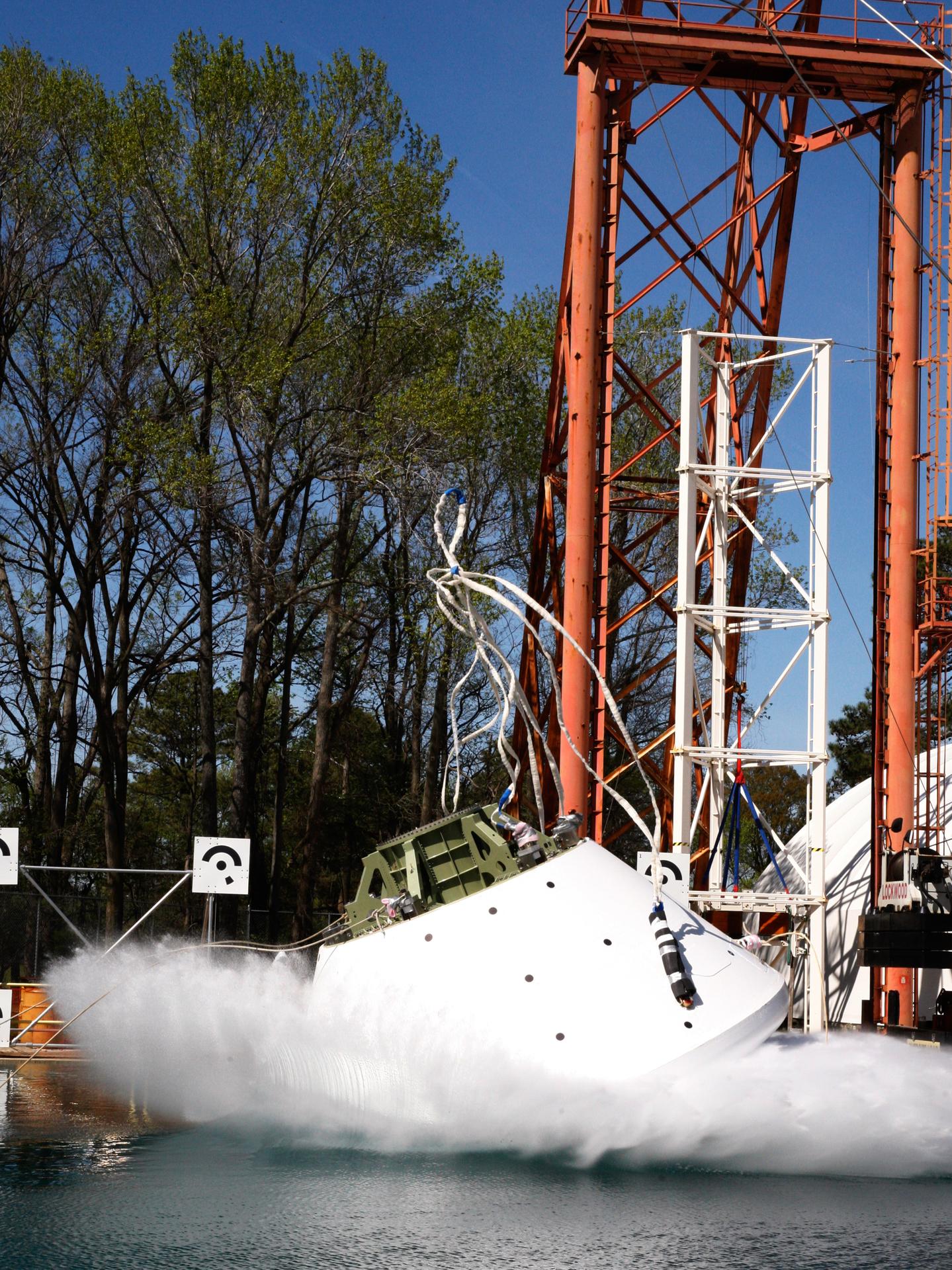 On April 6, 2016, engineers at NASA’s Langley Research Center in Hampton, Virginia, kicked off a series of nine drop tests of a representative Orion crew capsule with crash test dummies inside to understand what the spacecraft and astronauts may experience when landing in the Pacific Ocean after deep-space missions. The high-fidelity capsule, coupled with the heat shield from Orion's first flight in space, was hoisted approximately 16 feet above the water and vertically dropped into Langley’s 20-foot-deep Hydro Impact Basin. The crash test dummies were instrumented to provide data and secured inside the capsule to help provide information engineers need to ensure astronauts will be protected from injury during splashdown. Each test in the series simulates different scenarios for Orion’s parachute-assisted landings, wind conditions, velocities and wave heights the spacecraft may experience when touching down in the ocean.