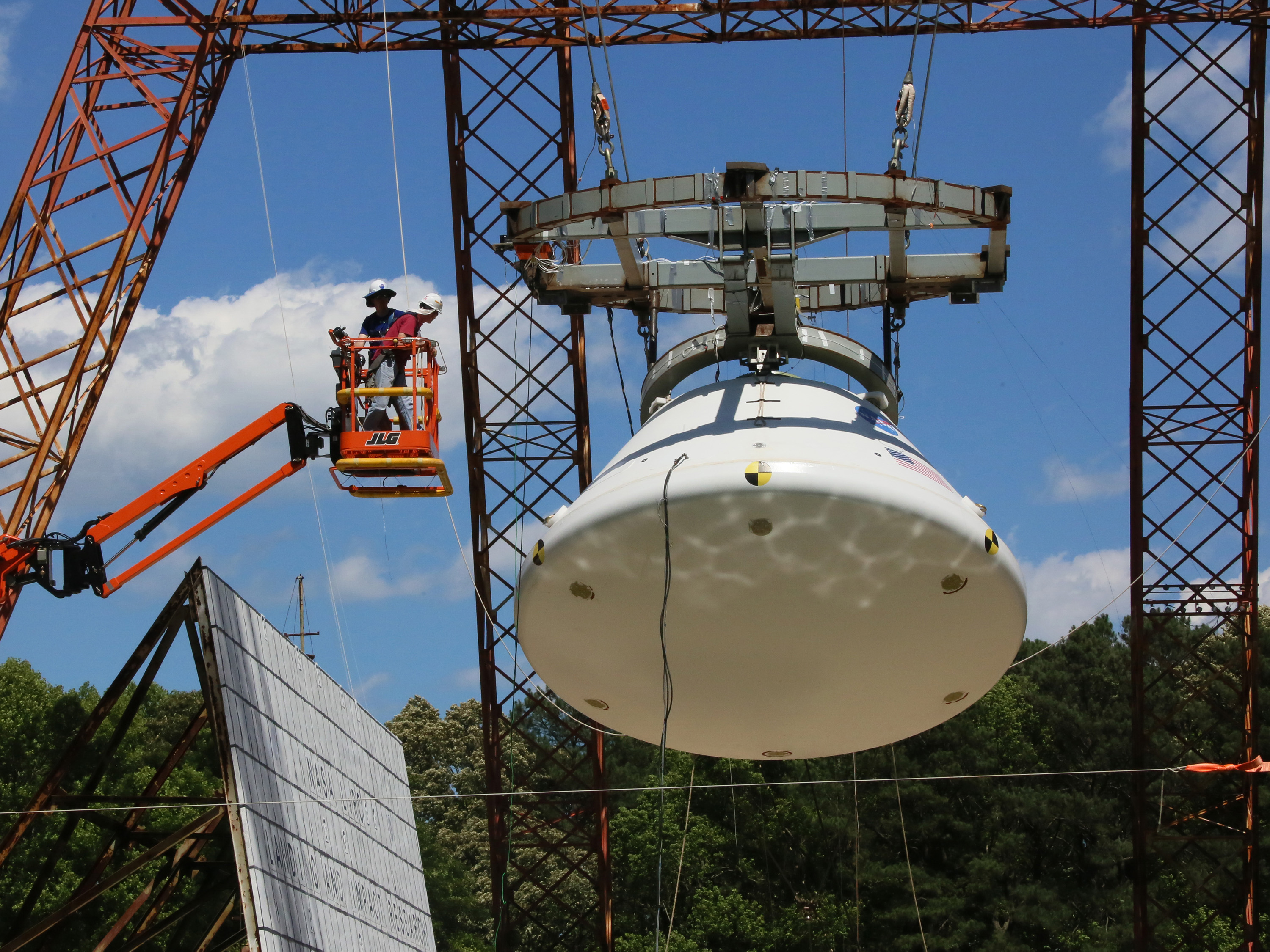 The Orion Ground Test Article completes its first swing water impact test at NASA's Langley Research Center in Virginia on June 8, 2016.