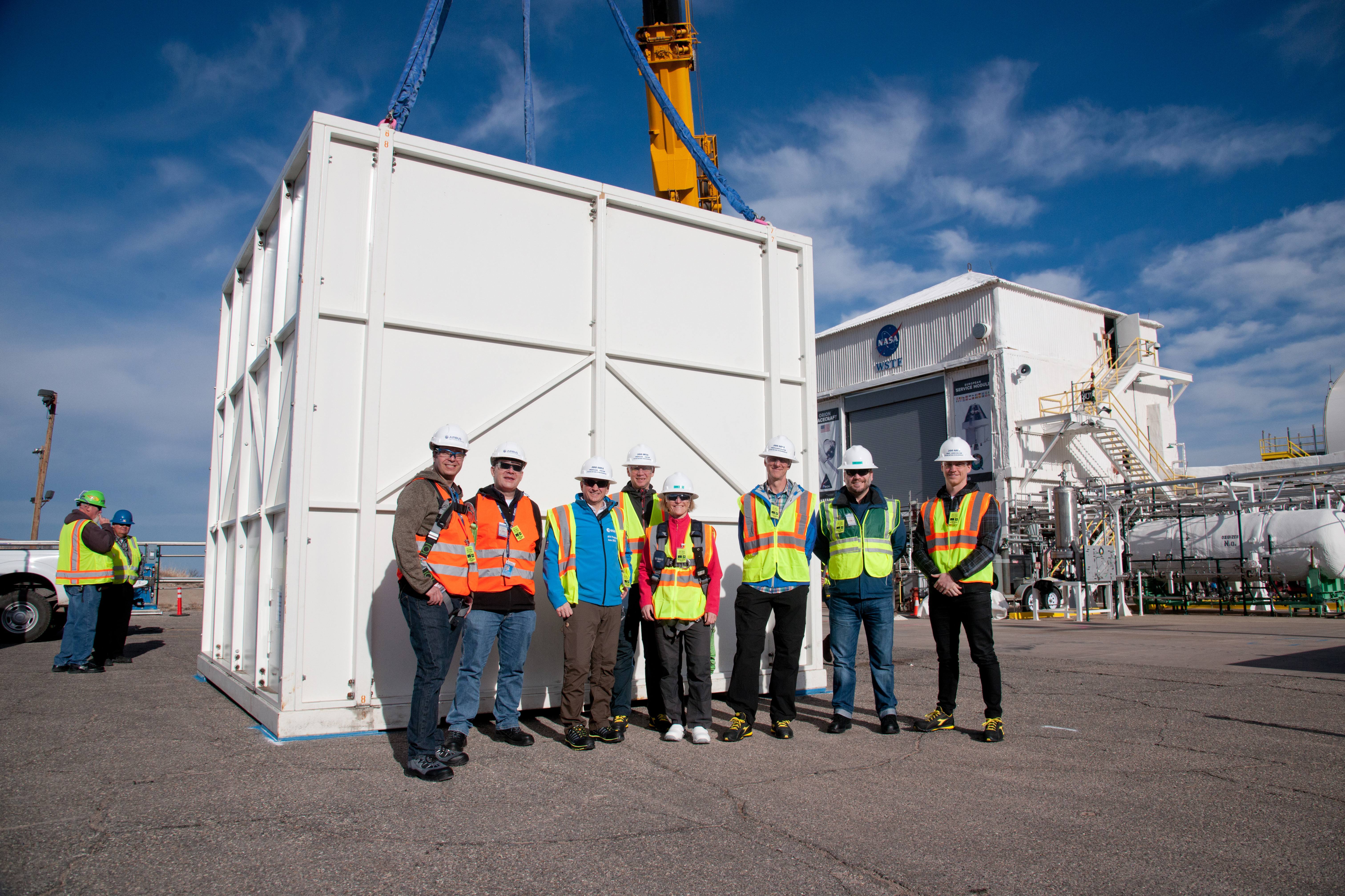 The European Service Module Propulsion Qualification Module (PQM) arrives at White Sands Test Facility in New Mexico on Feb. 18, 2017.